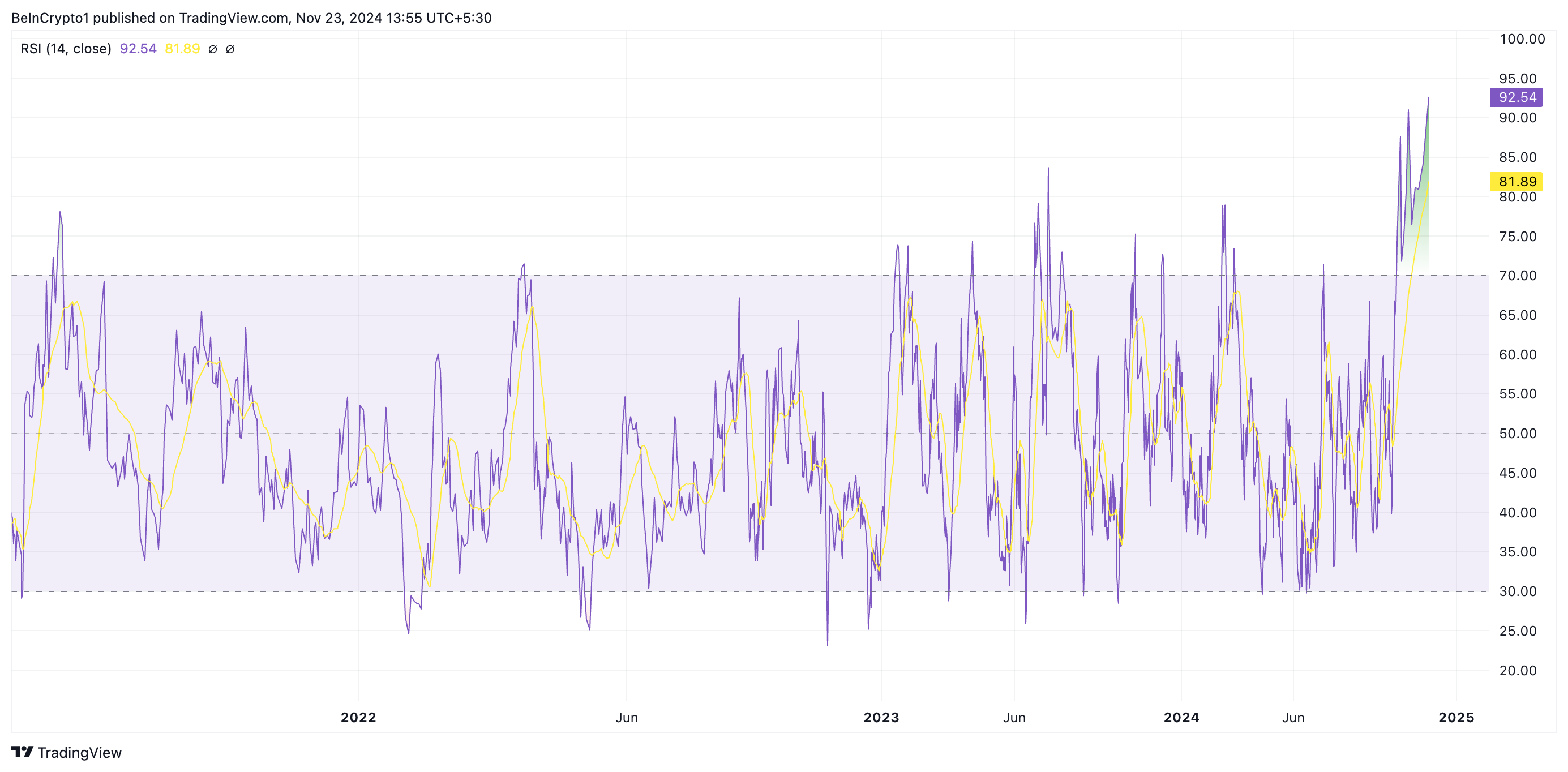 RSI måler en aktivas overkjøpte og oversolgte markedsforhold. Den varierer mellom 0 og 100, med verdier over 70 som indikerer at aktivaen er overkjøpt og trenger en korreksjon. På den annen side antyder verdier under 30 at aktivaen er oversolgt og kan oppleve en oppgang. XLMs RSI-avlesning på 92,54 antyder at den er betydelig overkjøpt og er i fare for en tilbakegang.