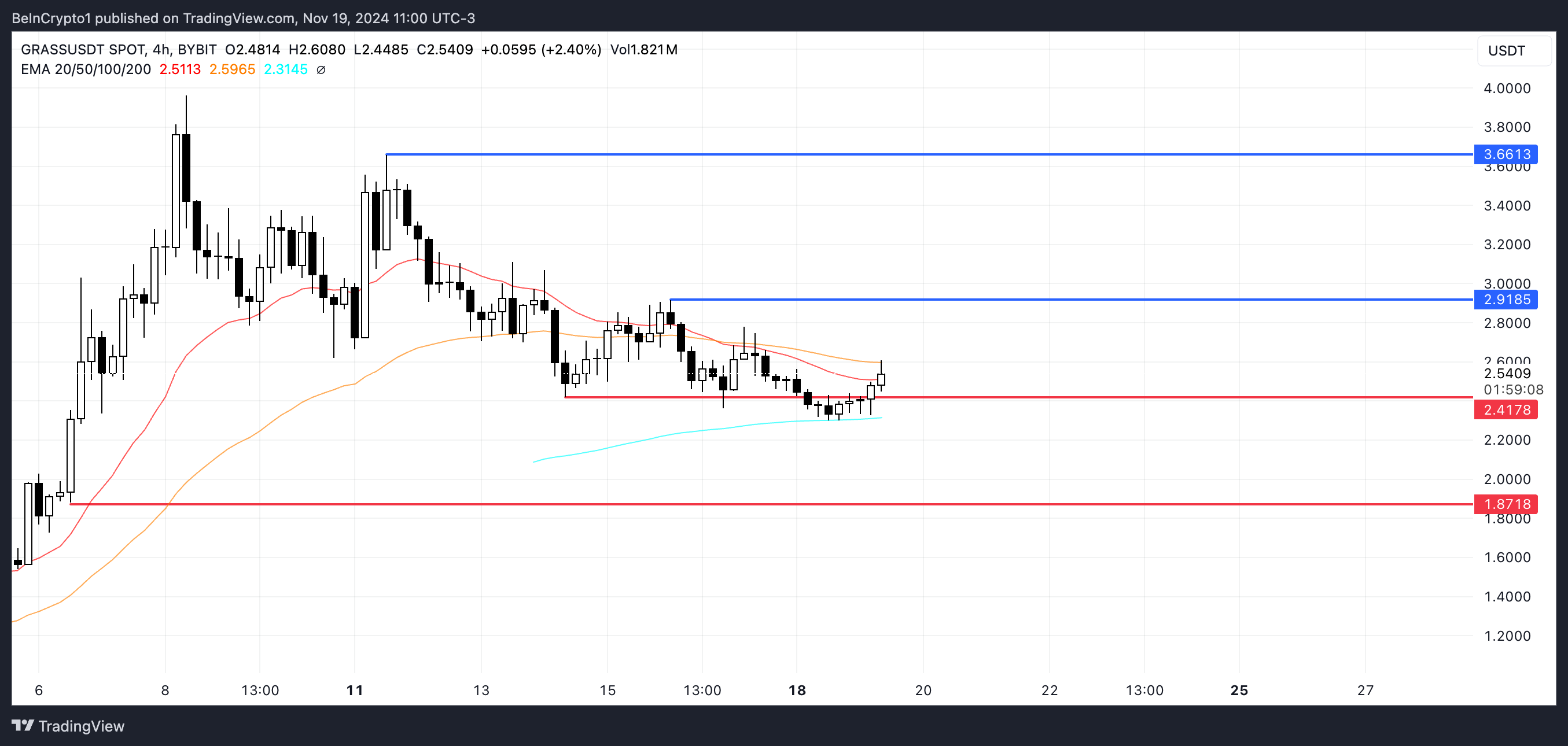 Hvis den oppadgående trenden styrkes, kan GRASS møte sin neste motstand på $ 2,91. Å bryte gjennom dette nivået kan utløse ytterligere bullish aktivitet, potensielt drive prisen til $ 3,66, noe som representerer en betydelig 44 % oppside. På den annen side, hvis den oppadgående trenden svekkes, kan prisen reversere, og teste støtte på $ 2,41.