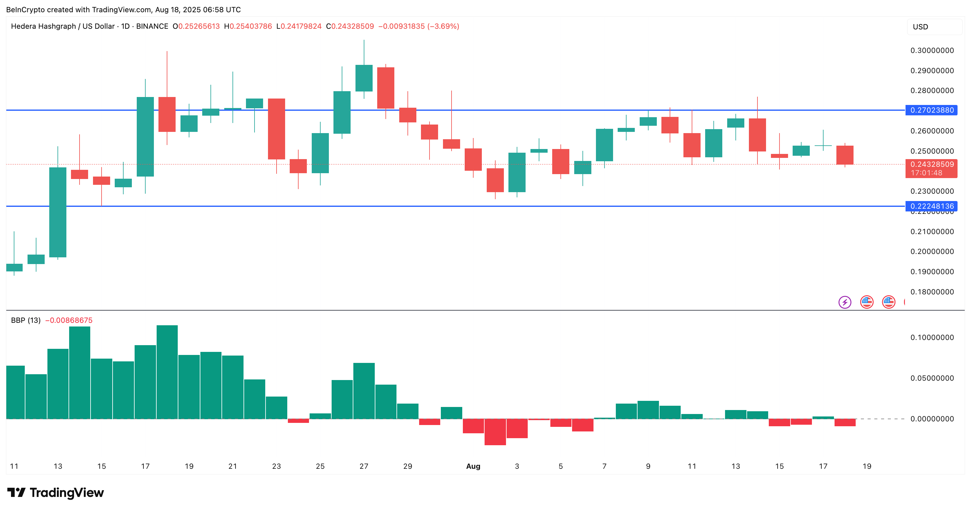 For det andre har en skjult bullish RSI-divergens vært i ferd med å dannes. Mellom 30. juli og 17. august har HBAR prisen gjort høyere bunner, mens 3-dagers RSI har vist lavere bunner. Dette er et klassisk tilfelle av momentum som nullstilles mens prisen opprettholder trendstrukturen, ofte et signal om at selgerne mister grepet.