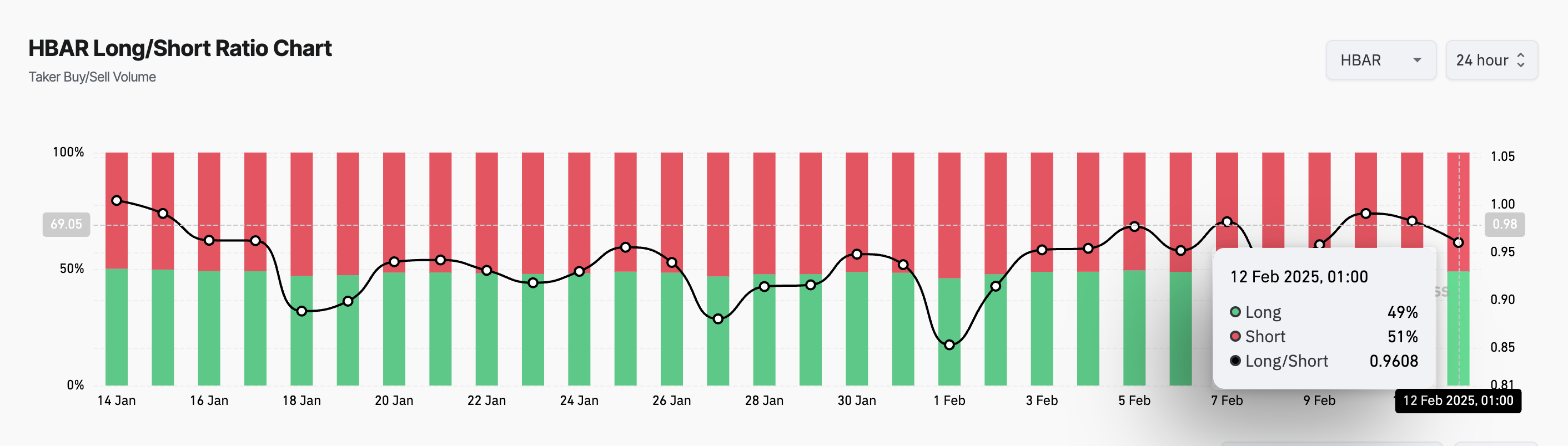 På den annen side, som med HBAR, indikerer en ratio under én at tradere i stor grad satser på en prisnedgang. Dette signaliserer en sterk bearish stemning i markedet, og forsterker forventningene om ytterligere nedside.