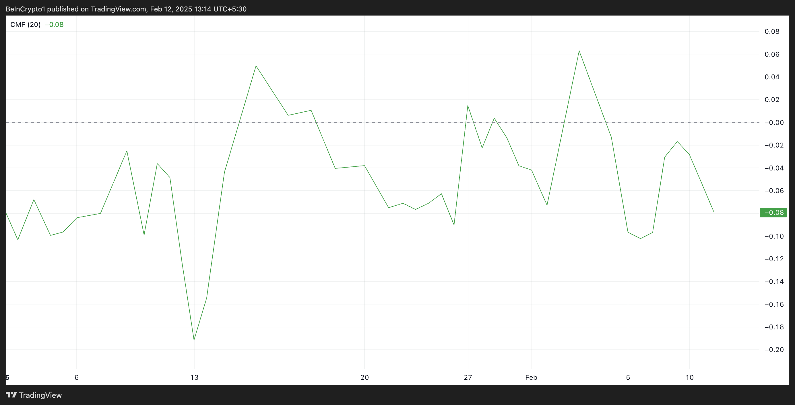 I tillegg viser avlesninger fra tekniske indikatorer som Chaikin Money Flow (CMF) salgsaktiviteten i HBAR spot-markeder. I skrivende stund er denne momentumindikatoren under null på -0,08 og i en nedadgående trend.