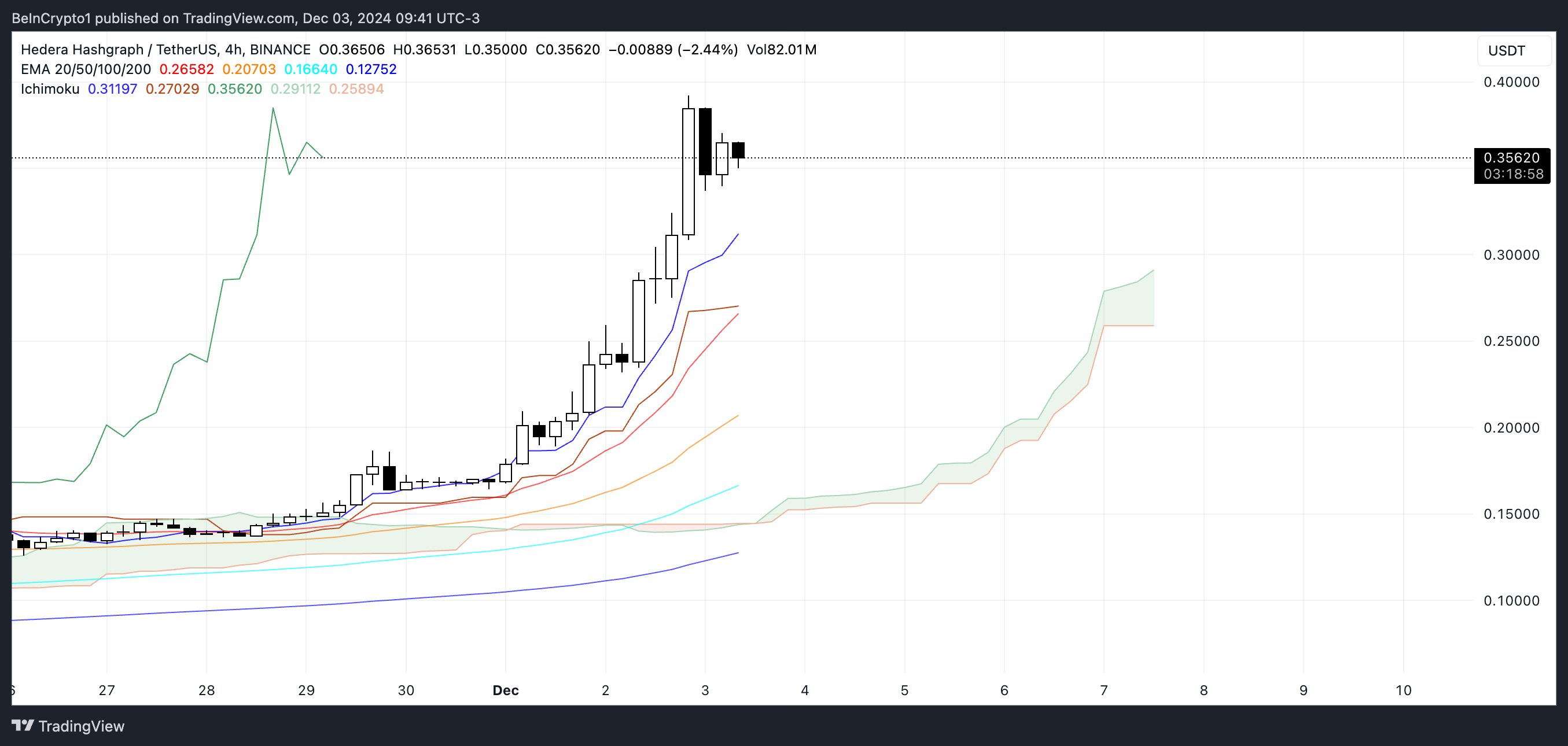 Ichimoku Cloud-diagrammet for Hedera viser sterkt bullish momentum, med prisen som handles godt over både basislinjen (kijun-sen) og konverteringslinjen (tenkan-sen).