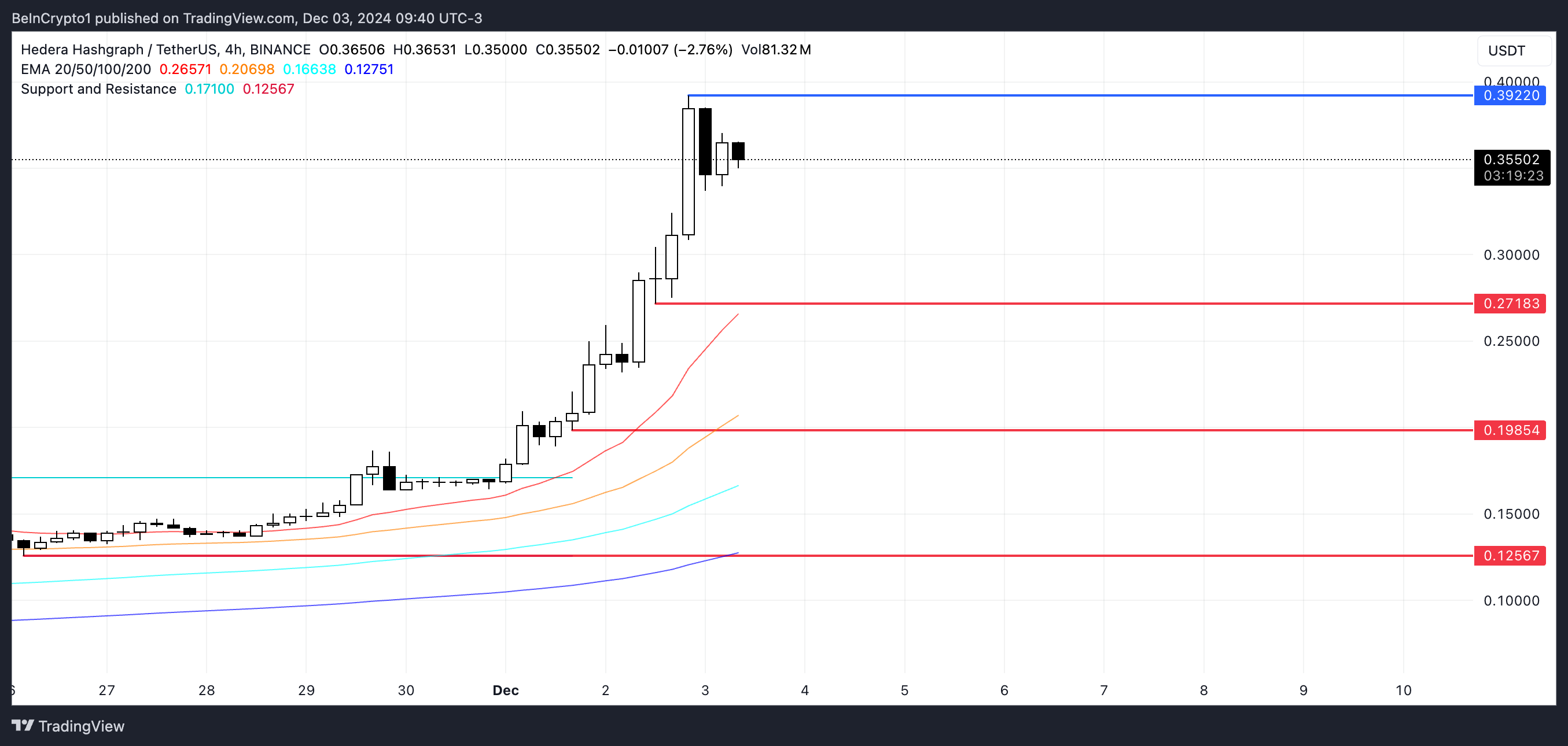 Imidlertid har den utvidede oppgangen presset prisen betydelig over nøkkel-EMA-ene og Ichimoku Cloud, noe som indikerer mulig overstrekk for HBAR kurs.