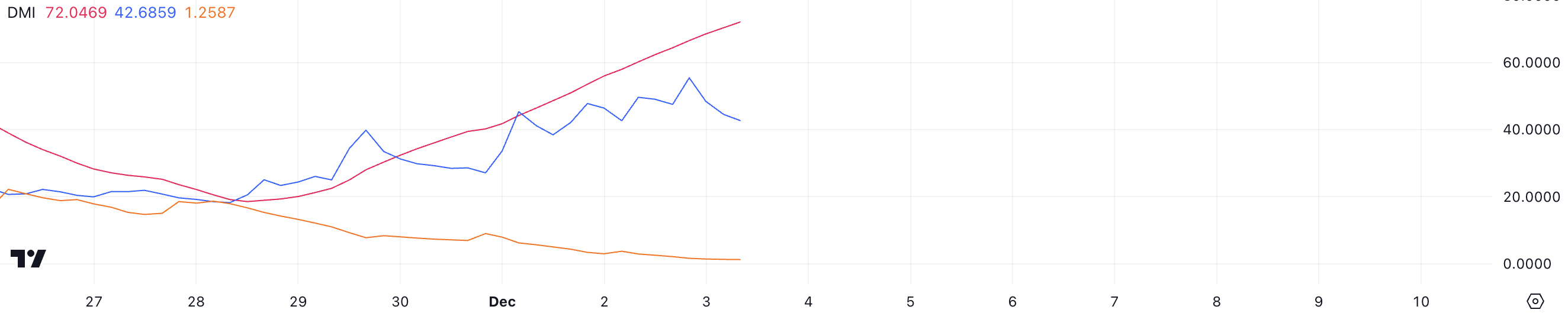 HBAR Directional Movement Index (DMI) viser en veldig sterk trend med en Average Directional Index (ADX) avlesning på 72.