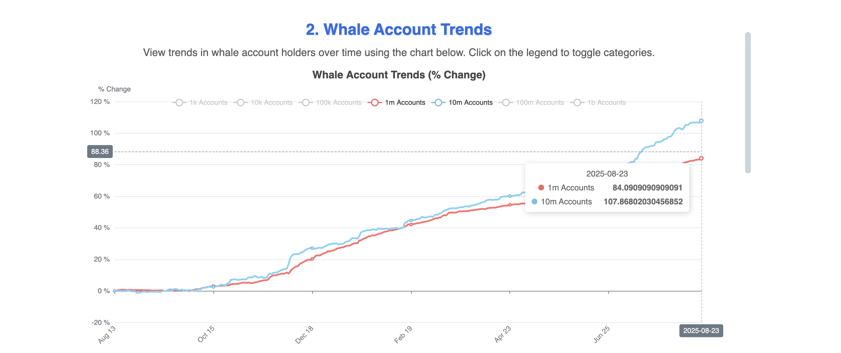 Den siste uken har store HBAR-innehavere utvidet sine posisjoner. Kontoer som holder minst 1 million tokens økte fra 82,41 den 16. august til 84,09 den 23. august. Tilsvarende steg 10 millioner token-båndet fra 106,59 til 107,86 i samme periode.