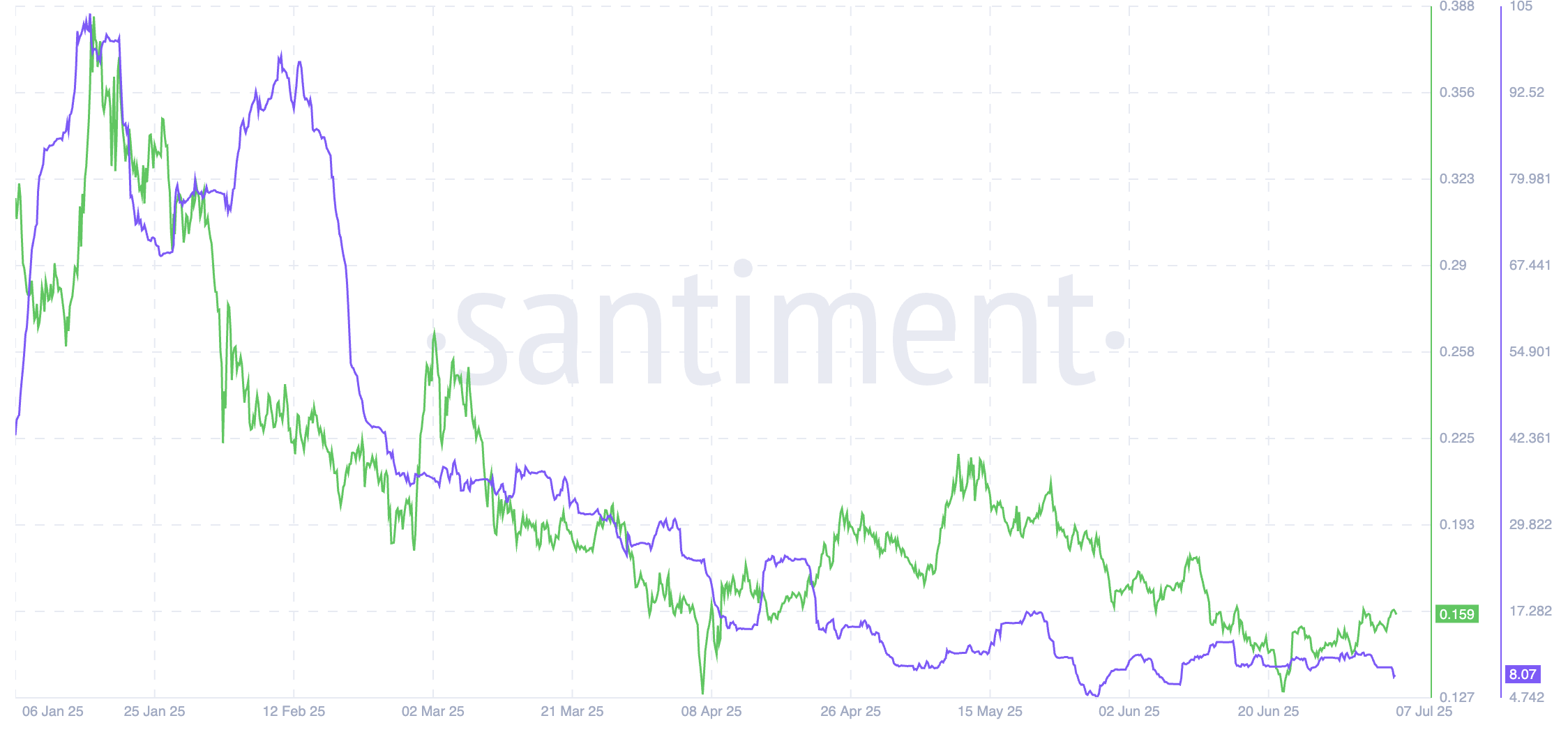 Mens pris- og derivatsentimentet snur, fortsetter Hederas utviklingsaktivitet å trende nedover. Ifølge ditt Santiment-diagram har den lilla linjen som representerer utviklingsbidrag vært på en langsom, men jevn nedgang siden mars.