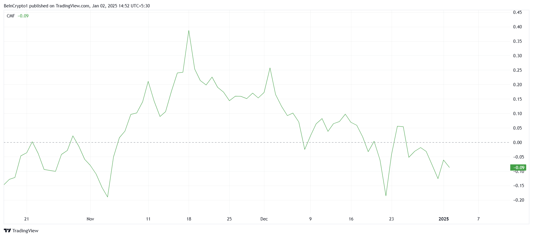 Chaikin Money Flow (CMF) indikatoren for HBAR er for øyeblikket under null-linjen, noe som signaliserer at utstrømninger dominerer aktivaen. Denne trenden reflekterer økende investortvil, med mange som trekker ut midlene sine på grunn av manglende momentum som støtter en prisøkning. Slike utstrømninger svekker ofte bullish sentiment og øker risikoen for et prisfall.