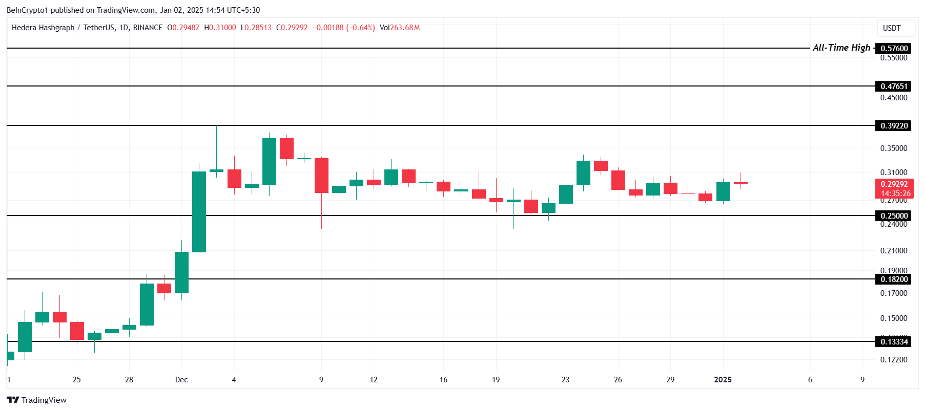 HBAR handles for øyeblikket sidelengs, fast mellom $ 0,39 og $ 0,25. Gjennom desember har altcoinen kun testet $ 0,39 motstanden én gang, noe som fremhever mangelen på vedvarende momentum. Denne rekkevidde-bundne oppførselen fremhever utfordringene HBAR står overfor i å oppnå en betydelig oppgang.