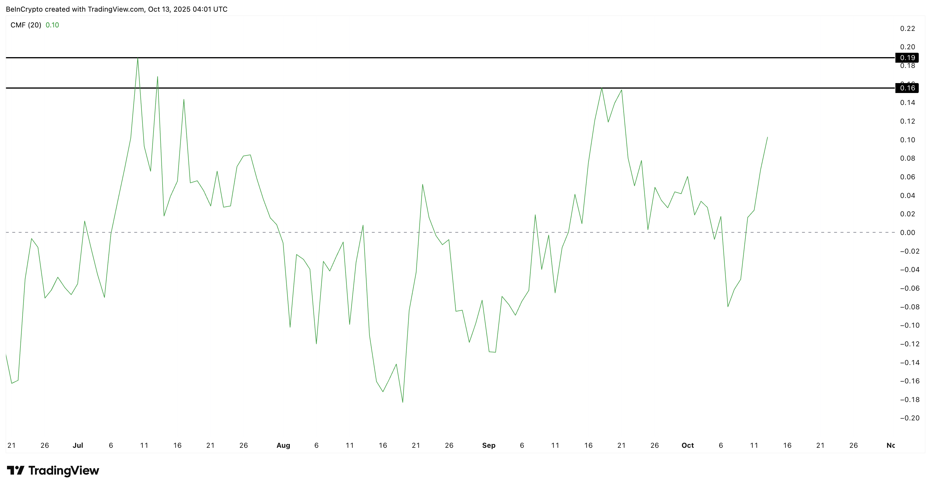 Chaikin Money Flow (CMF), som sporer større lommebokbevegelser, har også blitt sterkt positiv, nå rundt 0,10, noe som bekrefter at hvaler legger til kapital i stedet for å trekke seg ut. Merk at CMF begynte å stige rundt 7. oktober og ikke falt gjennom HBAR kurskrasjet— noe som viser at store innehavere forble trygge gjennom krasjet.