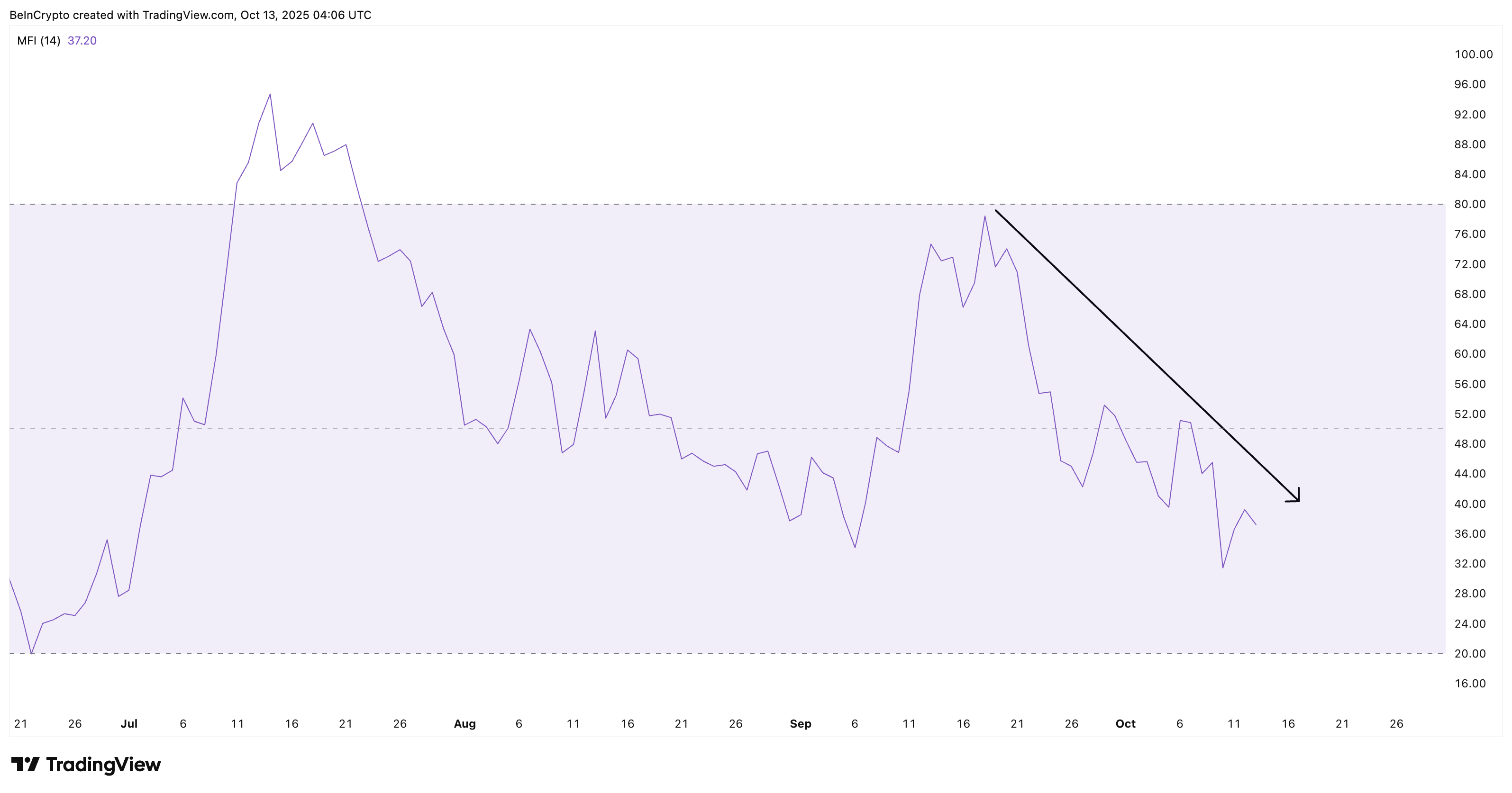I mellomtiden trender Money Flow Index (MFI), som reflekterer generell handelsaktivitet og private strømmer, lavere. Dette peker på svakere deltakelse fra private investorer og antyder at hvaler kan være hovedkraften som motvirker salgspresset for nå.