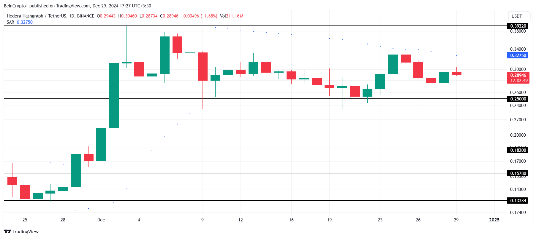Men hvis investorer begynner å selge for å sikre gevinster, kan HBAR miste det kritiske støttenivået på $ 0,25. En slik nedgang vil ugyldiggjøre den bullish utsikten, potensielt presse altcoinen ned til $ 0,18 og forsterke markedsskepsisen.
