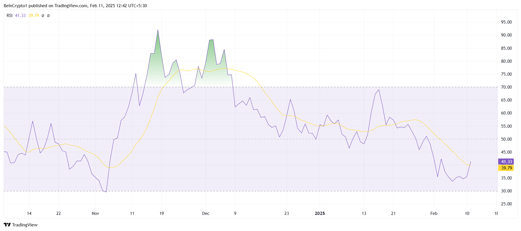 HBAR kursens Relative Strength Index (RSI) signaliserer en potensiell oppgang, noe som antyder at bullish momentum kan være i ferd med å ta seg opp. For øyeblikket er RSI i ferd med å komme seg fra sin månedlige bunn, noe som indikerer at kjøpspresset begynner å øke. Imidlertid vil dette momentumet bare bli bekreftet når RSI snur den nøytrale linjen på 50,0 til et støttenivå.