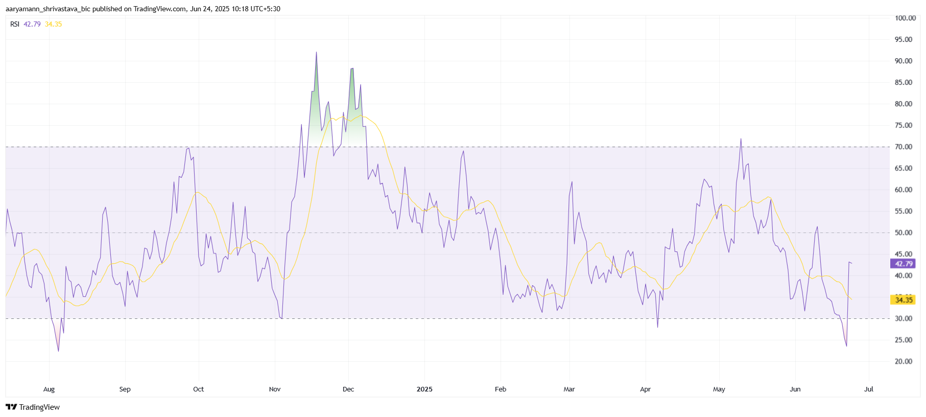 Den relative styrkeindeksen (RSI) for HBAR falt inn i det oversolgte området, og sank under den kritiske terskelen på 30,0. Dette markerte det laveste punktet for HBARs RSI på over 10 måneder. Vanligvis, når RSI går inn i det oversolgte området, signaliserer det en potensiell reversering. Ettersom RSI nå har steget tilbake, kan dette indikere at nedgangen nærmer seg slutten og en oppgang er i gang.