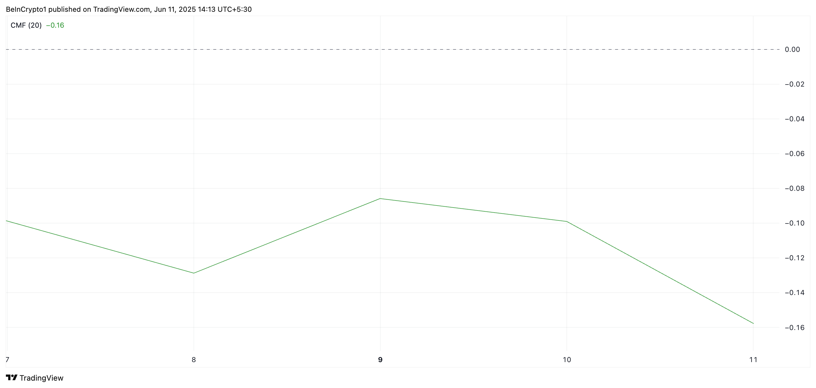 HBARs Chaikin Money Flow (CMF) viser en jevn nedgang selv om tokenens pris har steget de siste dagene. I skrivende stund ligger momentumindikatoren under null-linjen på -0,16.