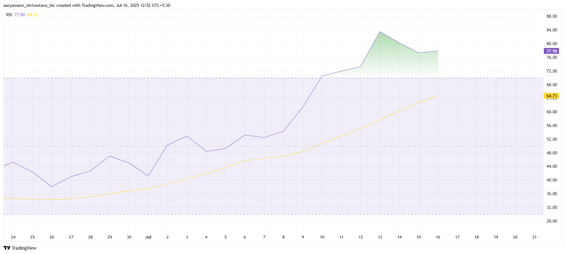 Den relative styrkeindeksen (RSI) viser at HBAR for øyeblikket er overkjøpt. Indikatoren strekker seg over 70,0-grensen, noe som historisk signaliserer en potensiell reversering. Når markedet opplever metning, kan bullish momentum skifte til bearish. Investorer har en tendens til å ta gevinster i slike situasjoner, noe som kan drive prisen lavere.