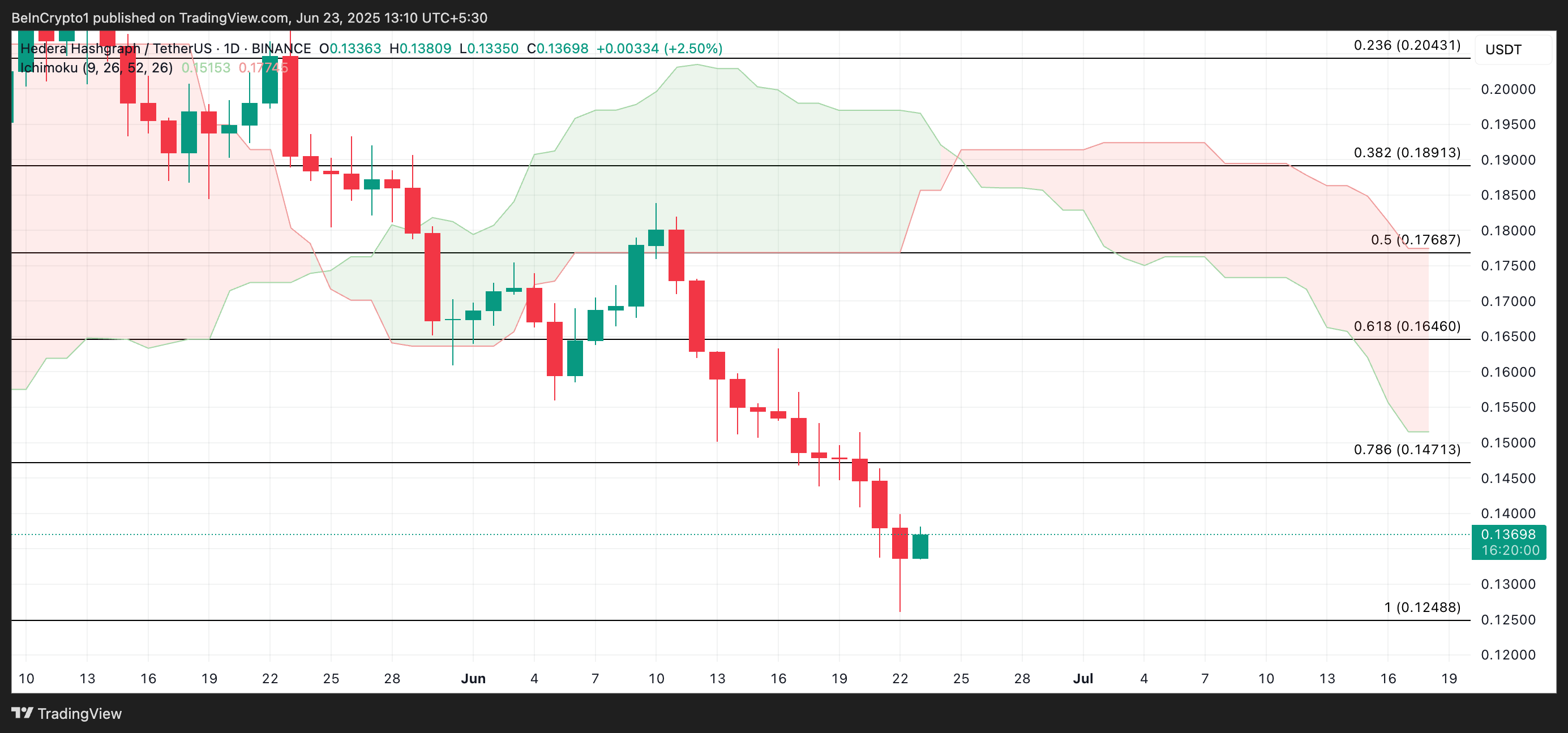 HBAR svever for øyeblikket like over $ 0,13-nivået, ifølge avlesninger fra HBAR/USD-dagsdiagrammet. Denne prissonen markerer et avgjørende støttenivå og representerer altcoinens laveste nivå hittil i år. Hvis etterspørselen svekkes, kan HBAR gjenbesøke dette kritiske nivået og potensielt bryte lavere.