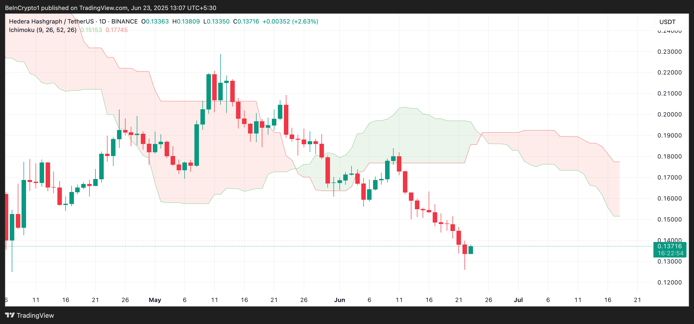 Videre har HBARs fler-måneders nedgang presset prisen under sin Ichimoku Cloud. I skrivende stund danner dette momentumindikatorens Leading Spans A og B motstand over tokenens pris på henholdsvis $ 0,15 og $ 0,17.