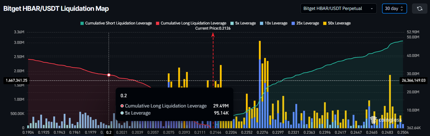 I følge Liquidation Map, kan HBAR møte betydelig press hvis prisen faller til $ 0,200. På dette nivået er nesten $ 30 millioner verdt av long-posisjoner sårbare for likvidasjon. En slik bevegelse vil utvilsomt ryste tradere som har forblitt optimistiske til tross for den nylige markedsnedgangen.