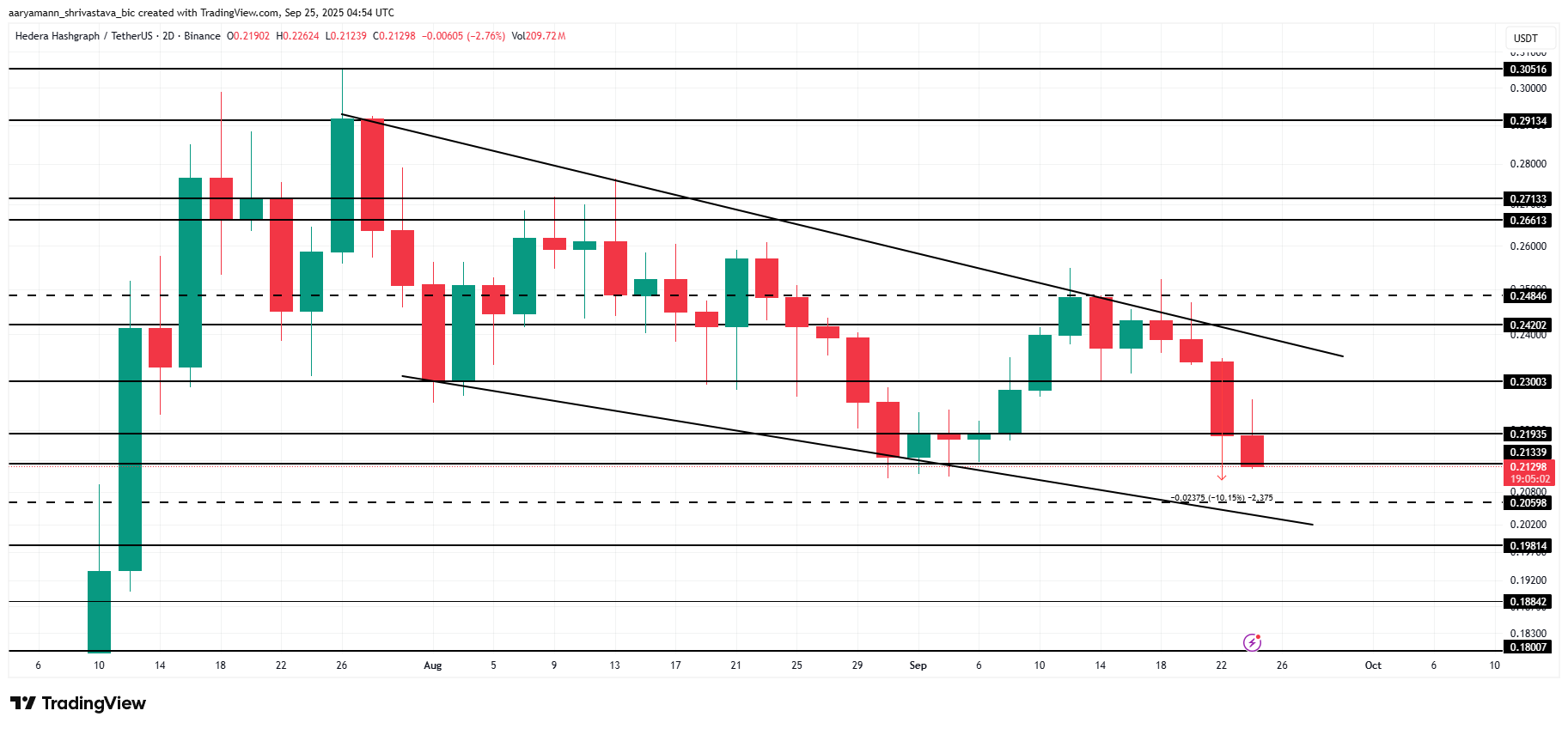 I skrivende stund handles HBAR til $ 0,212, og viser klare tegn på svakhet. Det fallende kilemønsteret antyder at tokenet kan teste den nedre trendlinjen på nytt, noe som signaliserer ytterligere kortsiktig nedside. Dette stemmer overens med den generelle bearish stemningen rundt markedet.