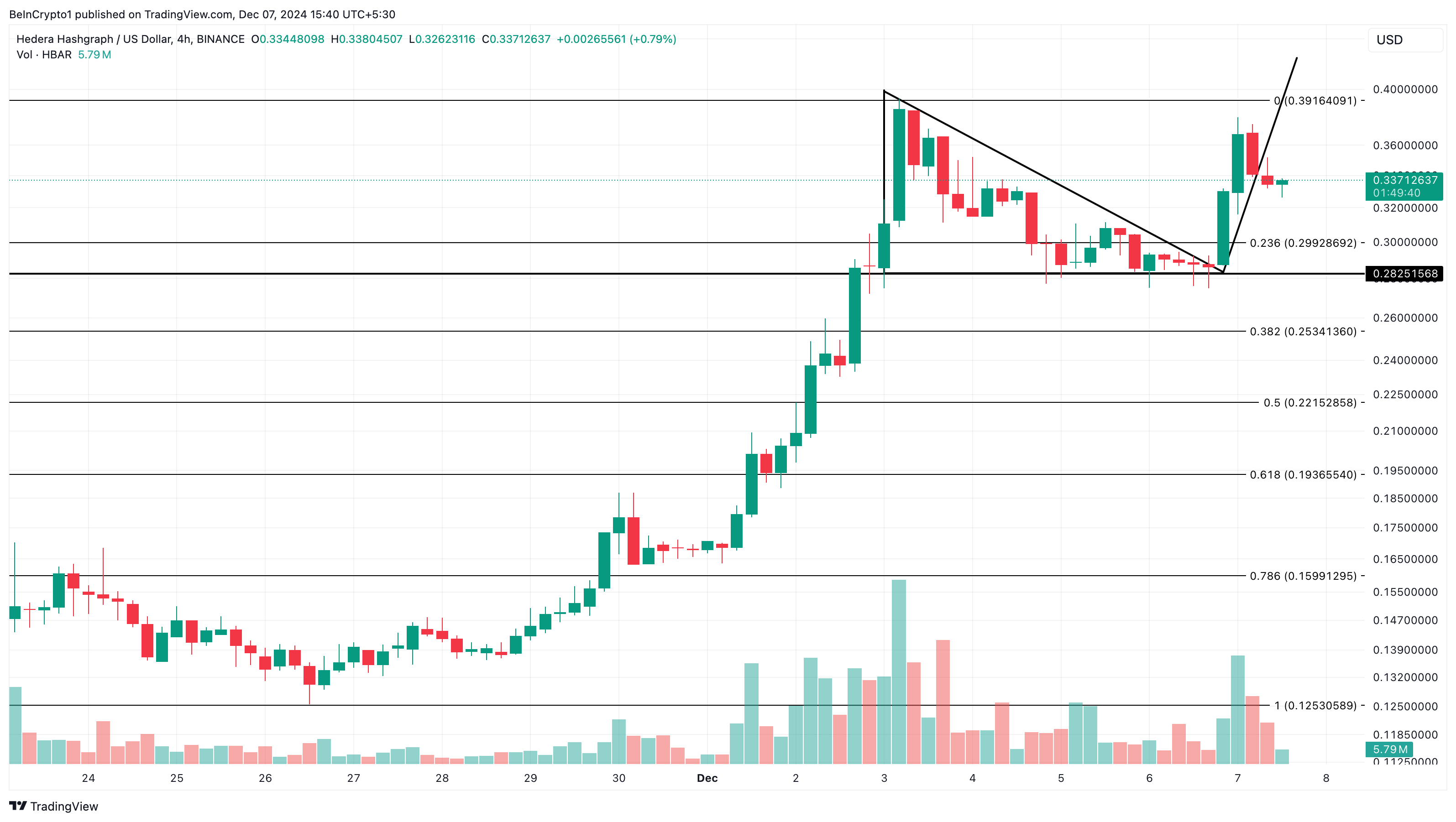På 4-timers diagrammet har HBARs pris brutt ut av en fallende trekant som ble dannet mellom 3. og 6. desember. En fallende trekant er et mønster som vanligvis indikerer en potensiell nedadgående trend.