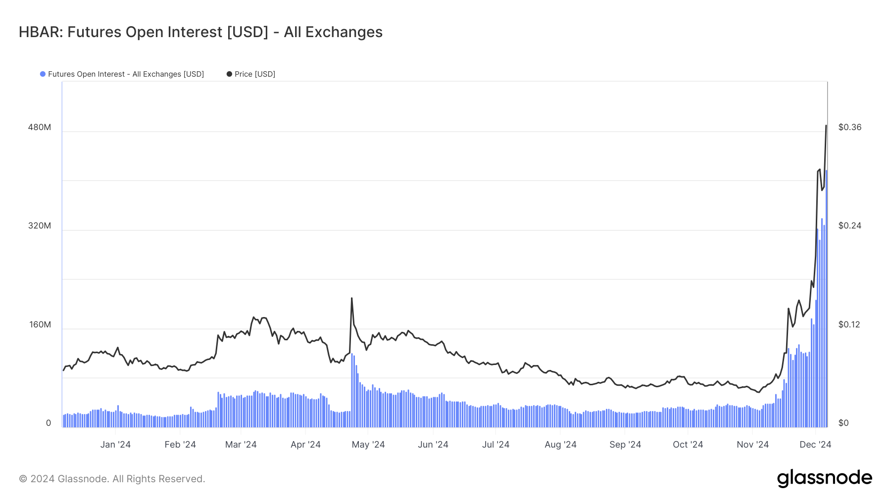 For noen dager siden rapporterte BeInCrypto hvordan HBARs åpne interesse økte til $ 220 millioner. Men i skrivende stund har den samme indikatoren, ifølge Glassnode, steget til $ 417,98 millioner. OI, som det ofte kalles, representerer det totale antallet åpne posisjoner i en kontrakt, med hver posisjon som har en lik kjøper og selger.