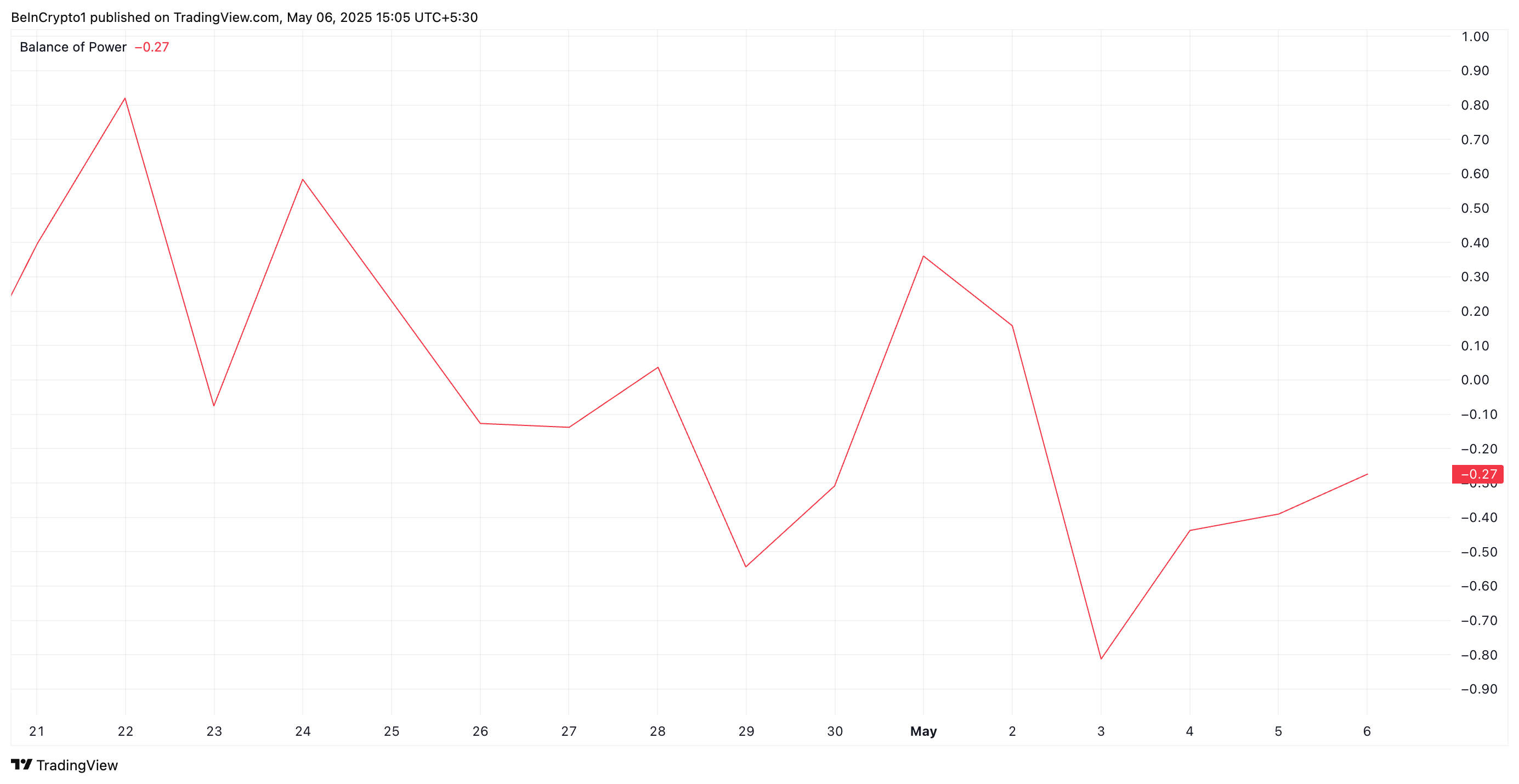 Denne indikatoren måler styrken til kjøpere versus selgere ved å analysere prisbevegelse innenfor en gitt periode. Når en aktivas BoP er negativ, indikerer det at selgere dominerer markedet. Dette øker sannsynligheten for fortsatt nedadgående press på HBARs pris på kort sikt.