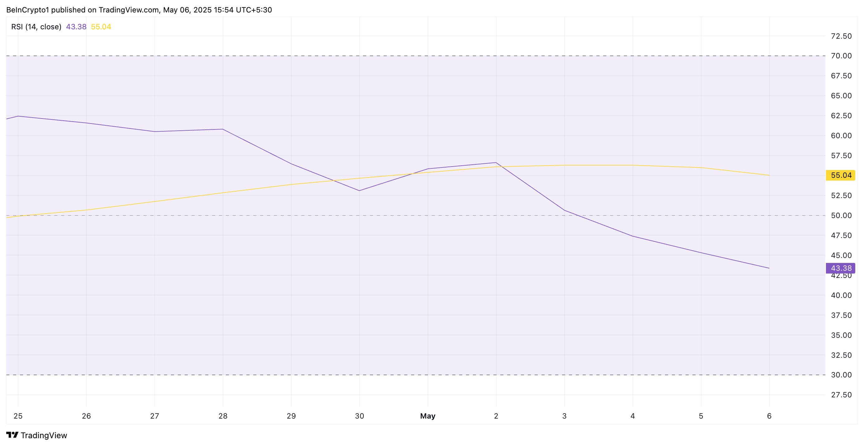 Relative Strength Index (RSI) er en momentumindikator som brukes til å vurdere om en aktiva er overkjøpt eller oversolgt. Den opererer på en skala fra 0 til 100, med avlesninger over 70 som vanligvis signaliserer overkjøpte forhold og en potensiell pris korreksjon. På den annen side antyder verdier under 30 at aktivaen er oversolgt og kan være klar for en oppgang.