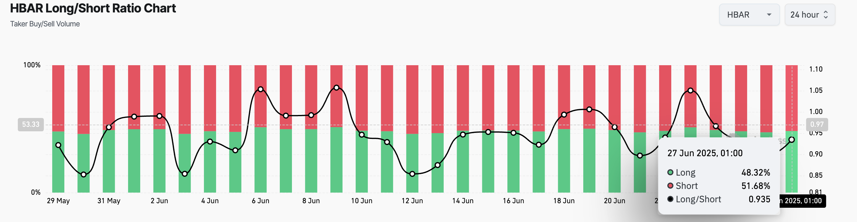 HBARs long/short ratio er for øyeblikket på 0,93, noe som signaliserer en preferanse for short-posisjoner blant deltakerne i futuresmarkedet.