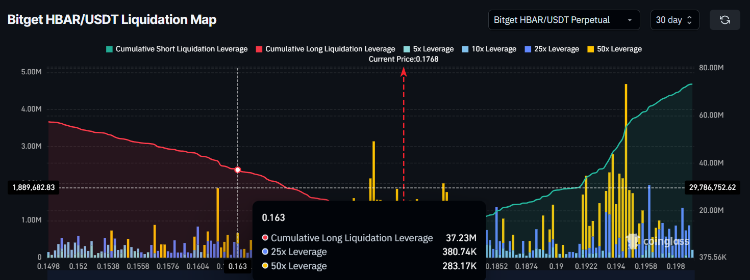Men hvis HBAR ikke klarer å bryte $ 0,182 motstanden og møter salgspress, kan prisen falle tilbake til den lokale støtten på $ 0,172. Et fall under denne støtten kan føre til en ytterligere nedgang til $ 0,163, og ugyldiggjøre det bullish utsiktene. En slik nedgang vil utløse $ 37,2 millioner i long likvidasjoner, dempe markedsstemningen og potensielt reversere den oppadgående trenden.