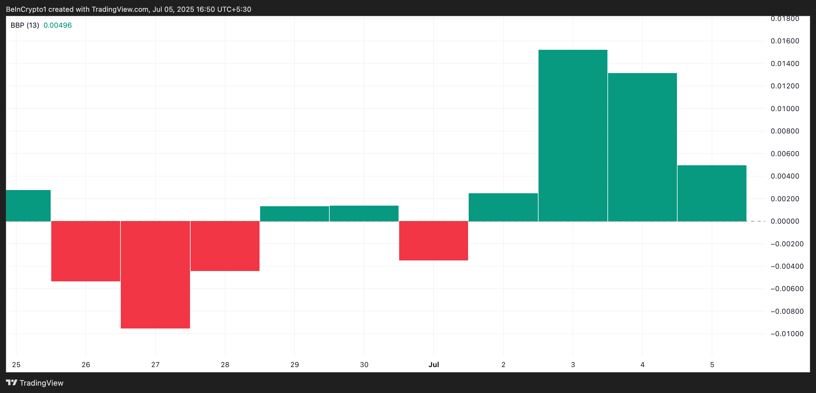 Indikatoren måler styrken til okser og bjørner i markedet. Når den viser grønne histogramstolper, indikerer det sterk kjøperdominans og økende oppadgående momentum.