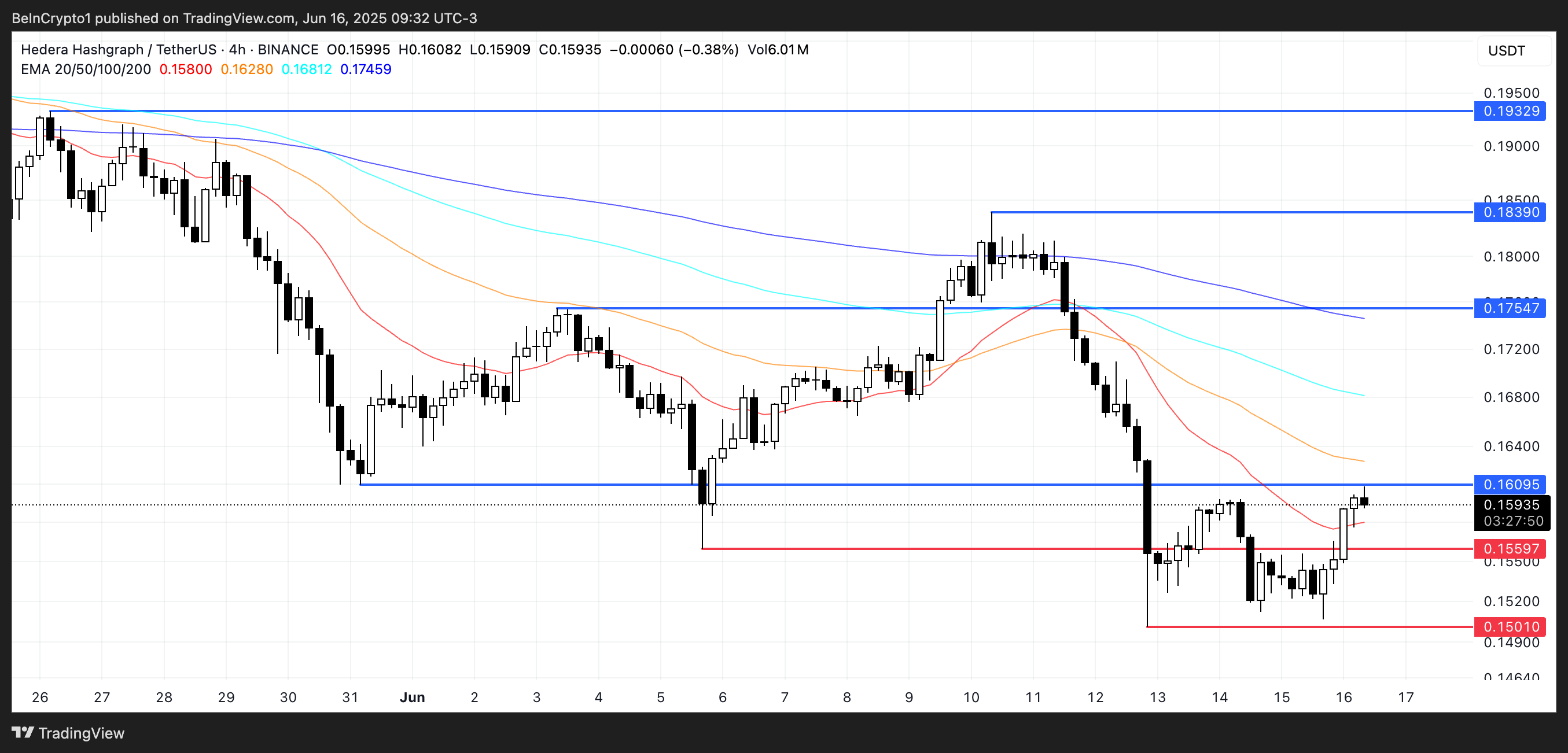 Hedera står overfor et avgjørende øyeblikk mellom $ 0,160 og $ 0,155
