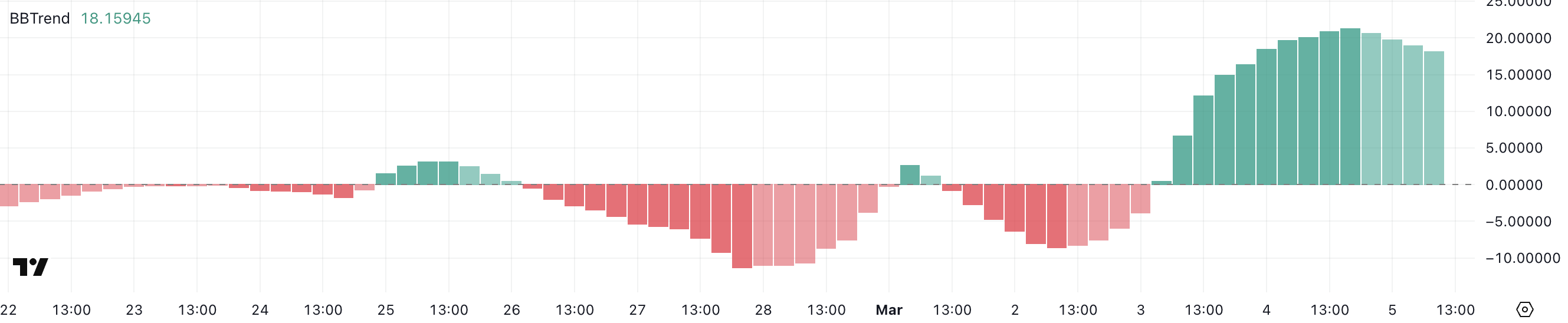 BBTrend, eller Bollinger Band Trend, er en teknisk indikator som måler trendstyrke basert på forholdet mellom pris og Bollinger Bands. Når BBTrend er positiv, antyder det at prisen handles i den øvre delen av Bollinger Bands, ofte som et signal om en pågående bullish trend.