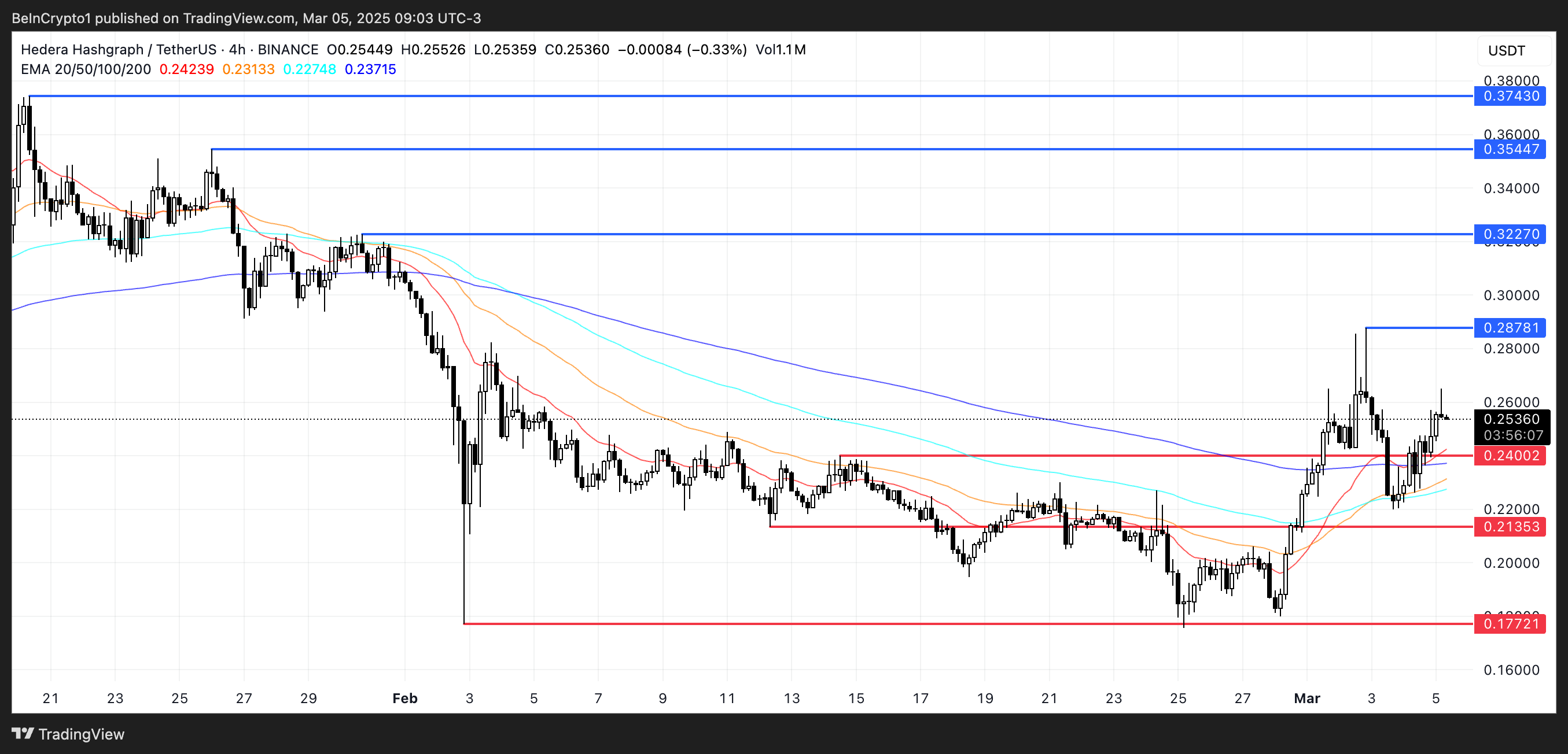 På den annen side, hvis opptrenden ikke materialiserer seg, kan HBAR møte en retest av støttenivået på $ 0,24.
