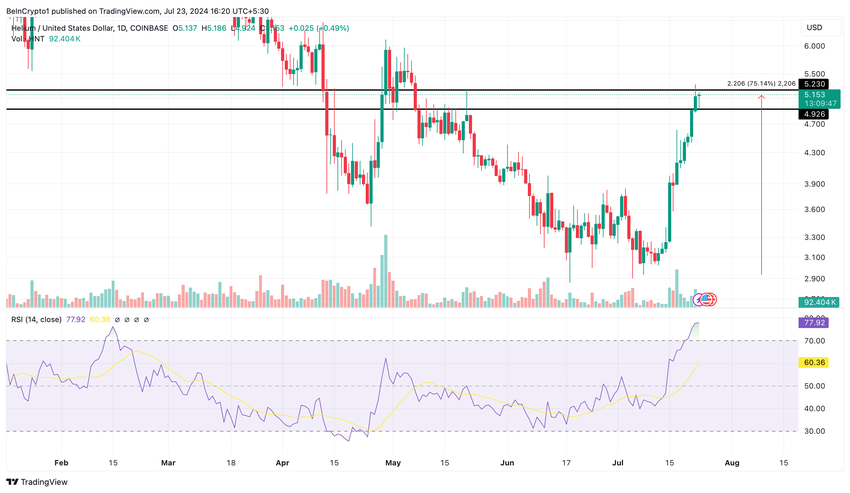 Til tross for den nylige oppgangen, som så HNT-kurser øke med 75 % på bare 15 dager, er det sjanser for nedgang. Tokenet handles rundt en motstand på $ 5,230. Videre, med Relative Strength Index (RSI) som når 77—en indikasjon på å være overkjøpt—kan det være en midlertidig tilbaketrekning ettersom salgspresset øker