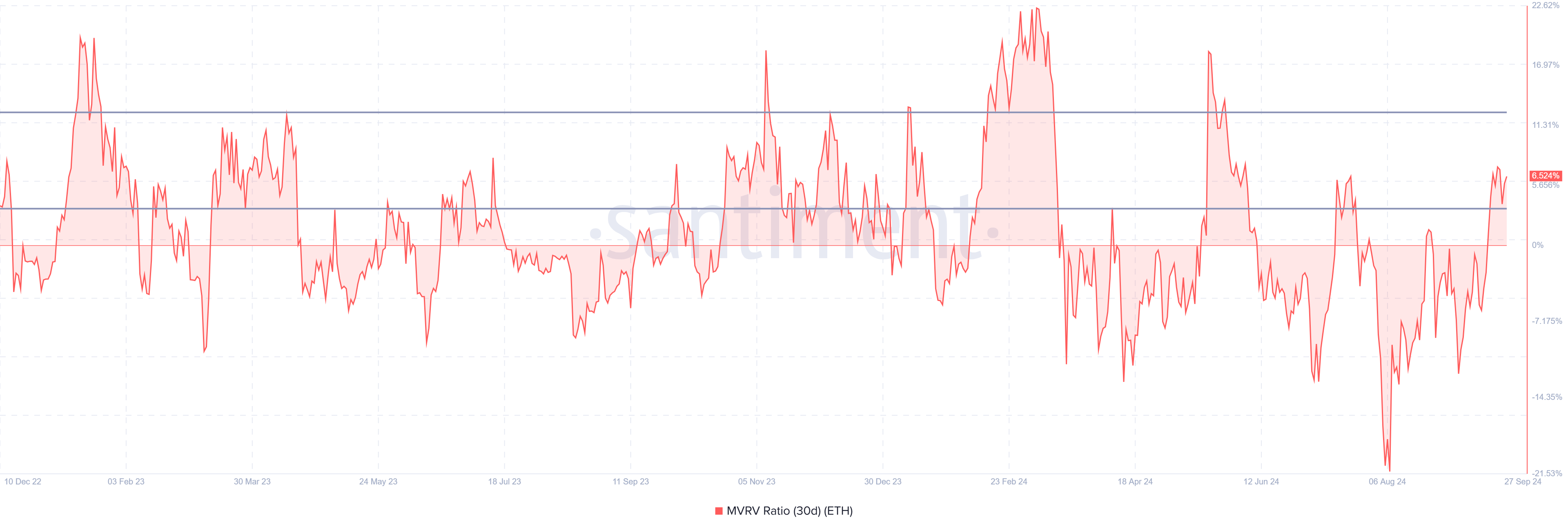 På den annen side er det også gradvis oppstått bearish signaler fra investorer. Ethereums 30-dagers MVRV-forhold ligger for øyeblikket på 6,5 %, noe som plasserer det i faresonen. MVRV-forholdet er en nøkkelindikator som måler fortjeneste og tap, og når det faller mellom 3 % og 12 %, pleier investorer å realisere fortjeneste ved å selge sine beholdninger.