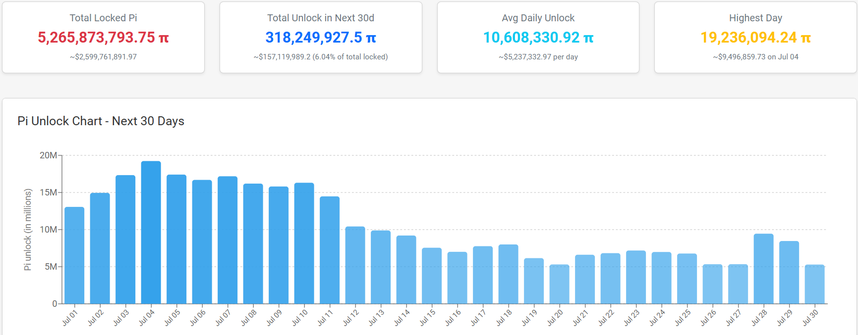 Pi Coin står overfor betydelig press i juli på grunn av den kommende token unlock hendelsen. Ifølge Pi Scan Unlock analyse vil mer enn 318 millioner Pi (PI), verdt nesten $ 160 millioner, gradvis bli frigjort gjennom måneden. Denne økte tilgangen kan tynge prisen.