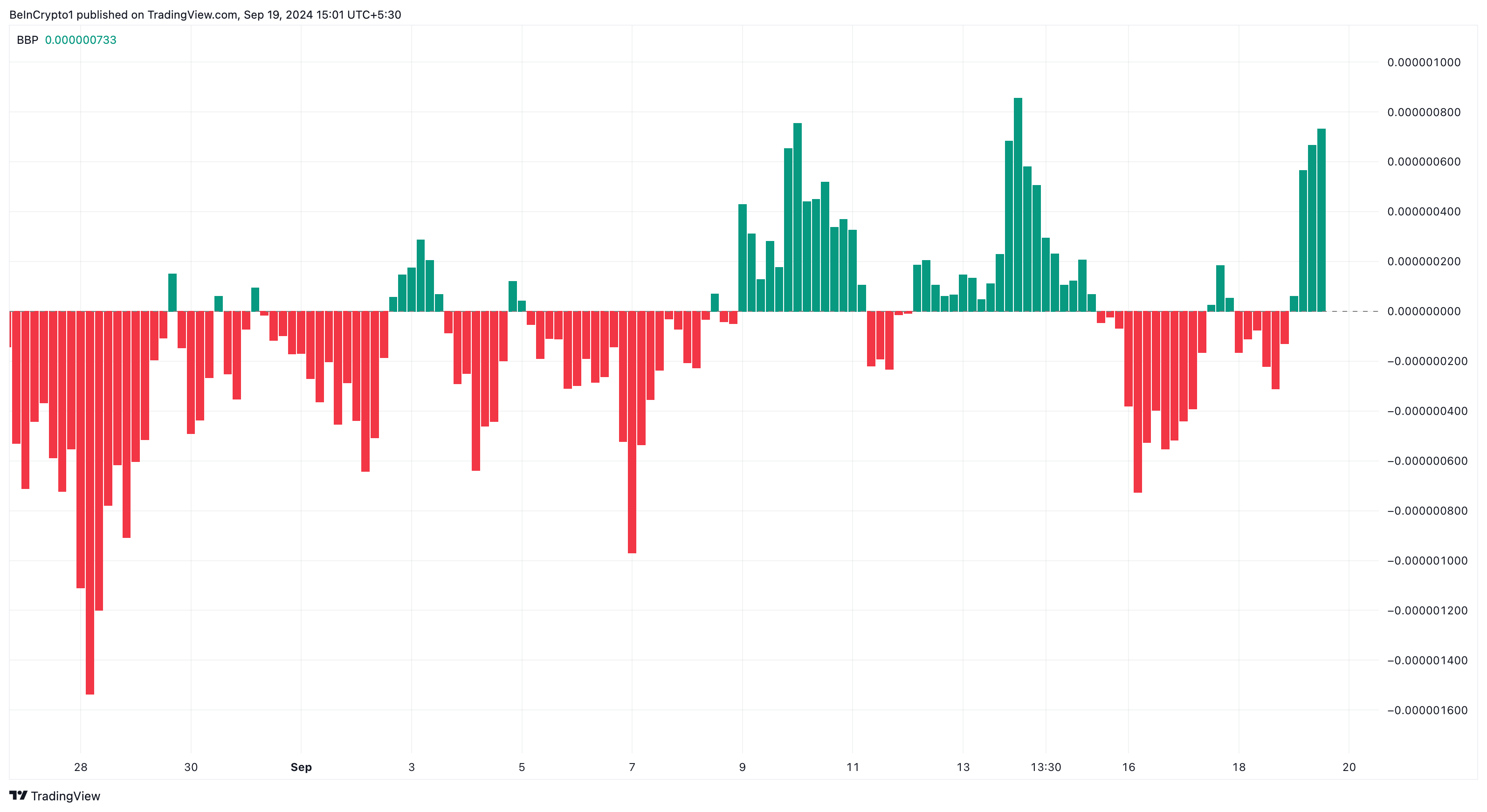 Dermed ser det ut til at PEPE er tilbake i tide for oksemarkedet og kan starte “Uptober” på en sterk note. En annen indikator som støtter denne bevegelsen er Bull Bear Power (BBP), et teknisk analyseverktøy som måler trendstyrke og oppdager divergenser mellom momentum og pris.
