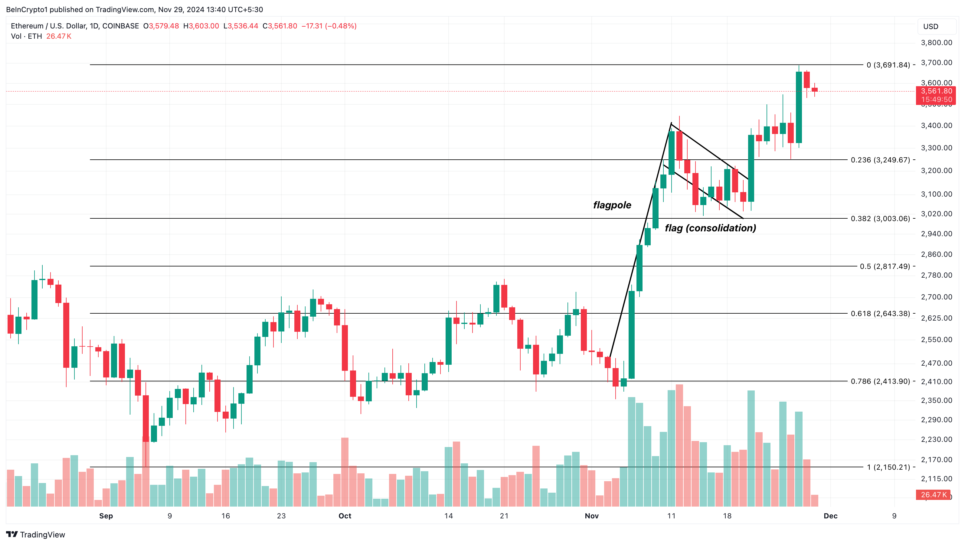 Fra et teknisk perspektiv, har Ethereum dannet et bull flagg på det daglige diagrammet. Bull flagg-mønsteret har en skarp stigning, ofte referert til som “flaggstangen,” etterfulgt av en stram, rektangulær konsolideringsfase kjent som “flagget.”