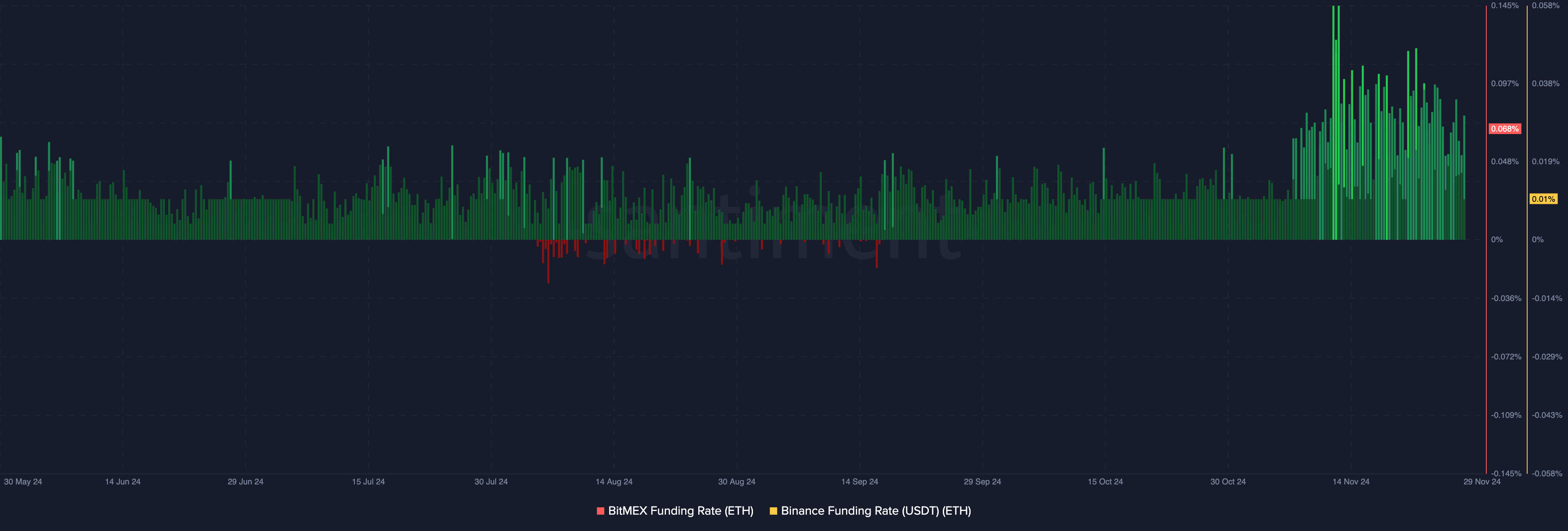 Når den er positiv, har longs overtaket. Men hvis den er negativ, har shorts det. I skrivende stund er finansieringsratene på begge børsene svært positive. Dette indikerer at longs er dominerende, og de fleste tradere forventer at ETHs pris vil øke i desember.
