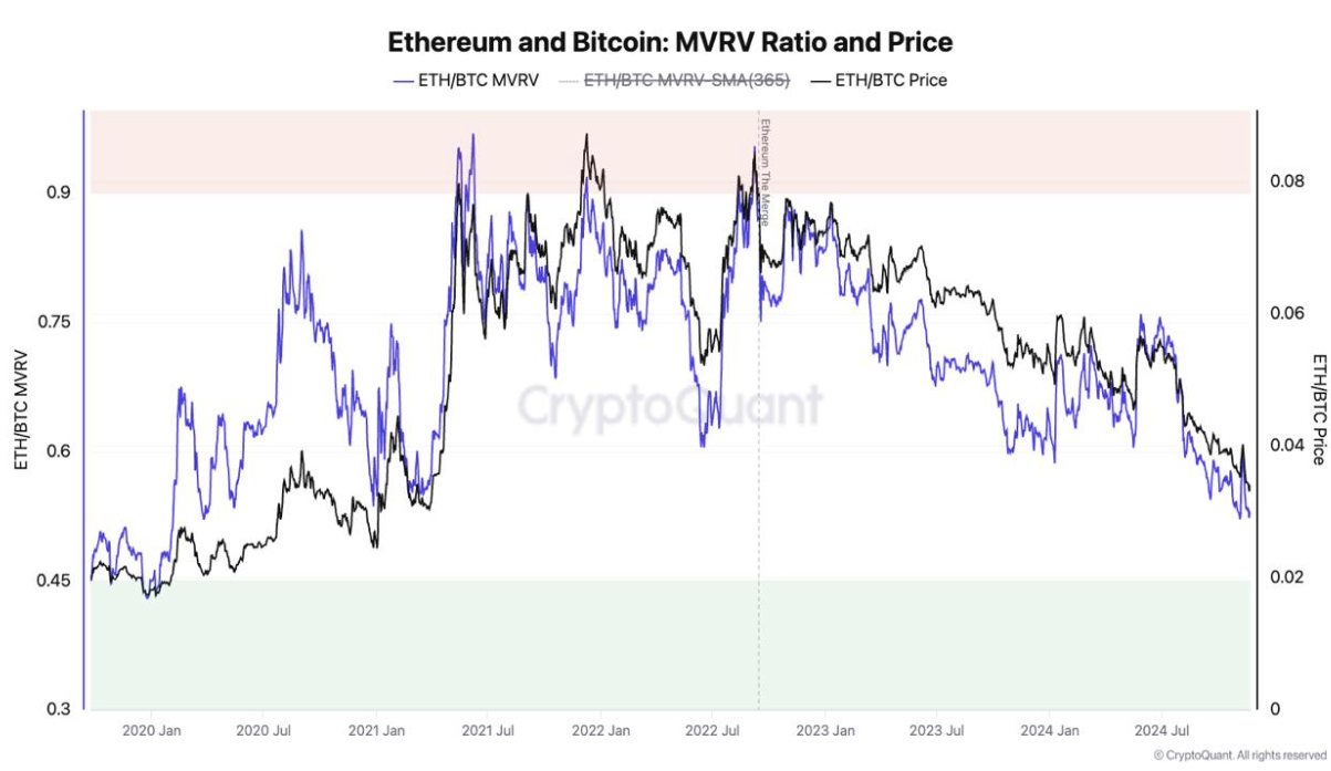 En annen analytiker som snakket med BeInCrypto om ETHs potensial neste måned er Julio Moreno, forskningssjef hos CryptoQuant. Ved å bruke Market Value to Realized Value (MVRV) ratio, sier Moreno at ETH nærmer seg en undervurdert tilstand i forhold til BTC.