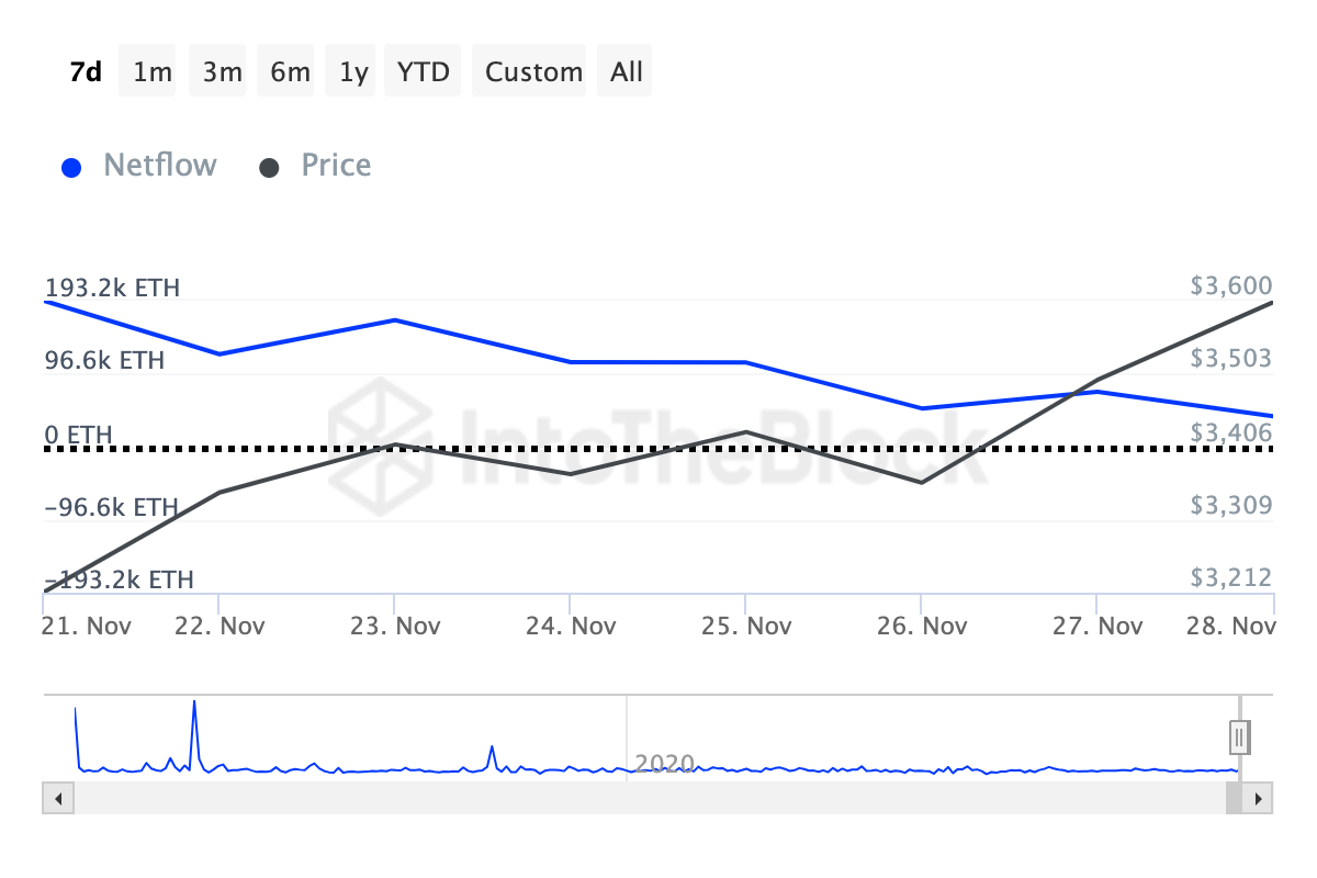 Men i skrivende stund har Ethereums store innehaveres nettoflyt avtatt, noe som tyder på at hvalene ikke lenger akkumulerer så mye som de gjorde for noen dager siden. Hvis dette fortsetter, kan ETHs pris finne det utfordrende å nå $ 4000 neste måned.
