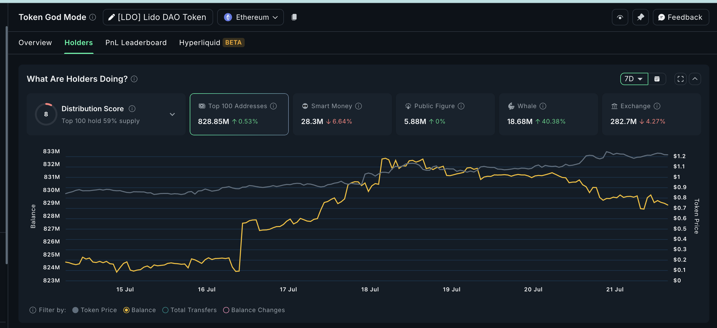 Børssaldoer falt med 4,27 % til 282,7 millioner LDO, noe som tyder på fortsatt utstrømning ettersom tokens flyttes til selvforvaring. Videre kontrollerer de 100 største innehaverne nå 828,85 millioner tokens, opp 0,53 %, noe som viser økende dominans og strammere tilbudskonsentrasjon.