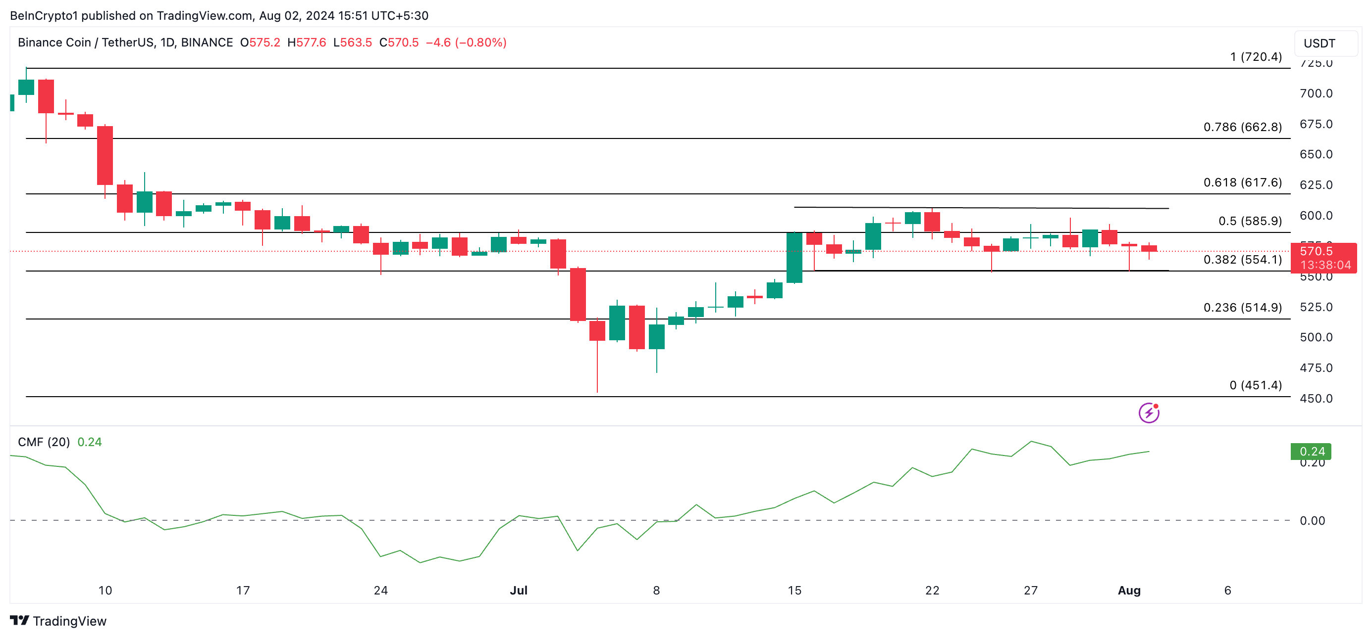 Imidlertid har myntens Chaikin Money Flow (CMF) opprettholdt en oppadgående trend i løpet av den perioden. Denne indikatoren måler pengeflyt inn og ut av et aktivs marked. I skrivende stund er BNBs CMF 0,24.