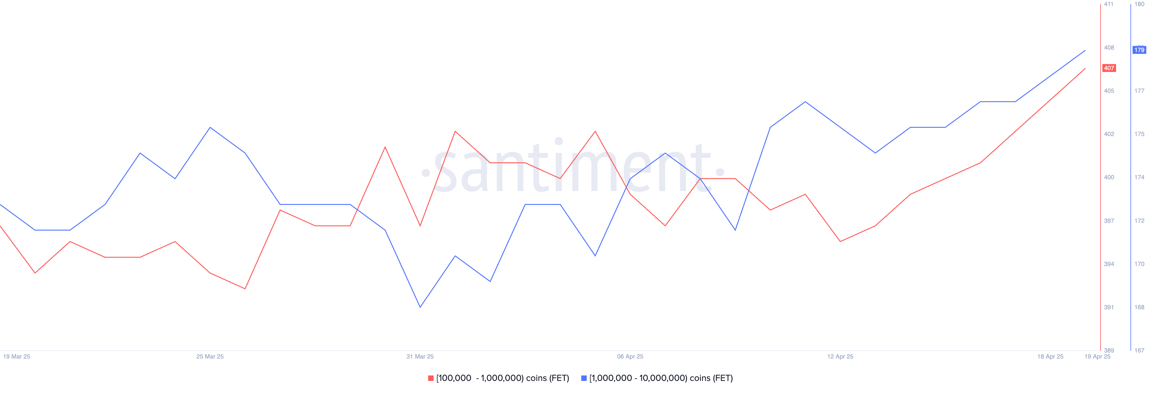 Antallet FET-hvaler—lommebøker som inneholder mellom 10 000 og 1 000 000 tokens—økte fra 572 den 13. april til 586 innen 19. april.