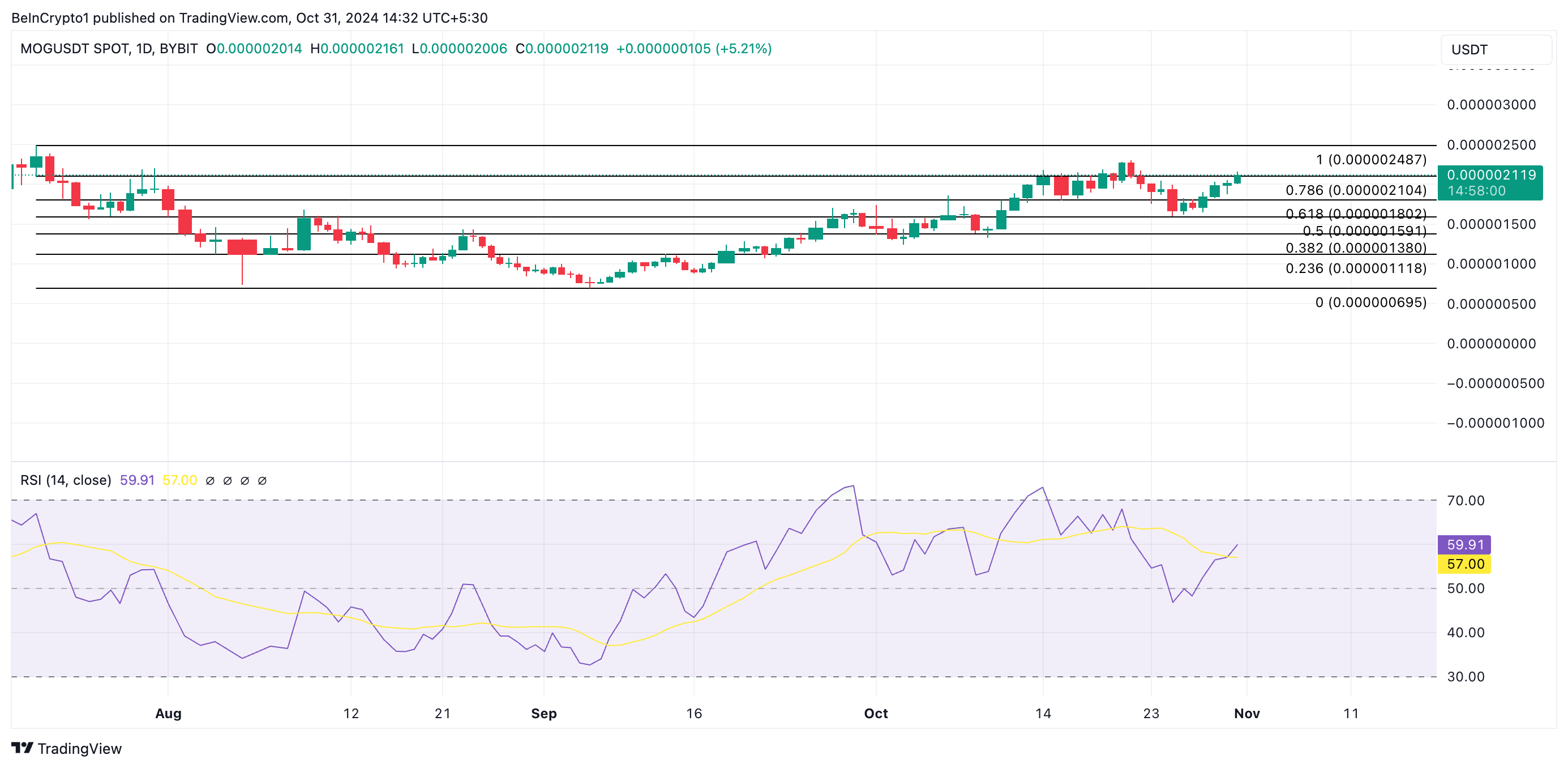 Meme coinens stigende Relative Strength Index (RSI) antyder et sterkt potensial for å snu denne motstanden til et støttenivå. For øyeblikket står MOGs RSI på 59,91, noe som indikerer betydelig kjøpepress ettersom den sporer aktivaens oversolgte og overkjøpte markedsforhold.
