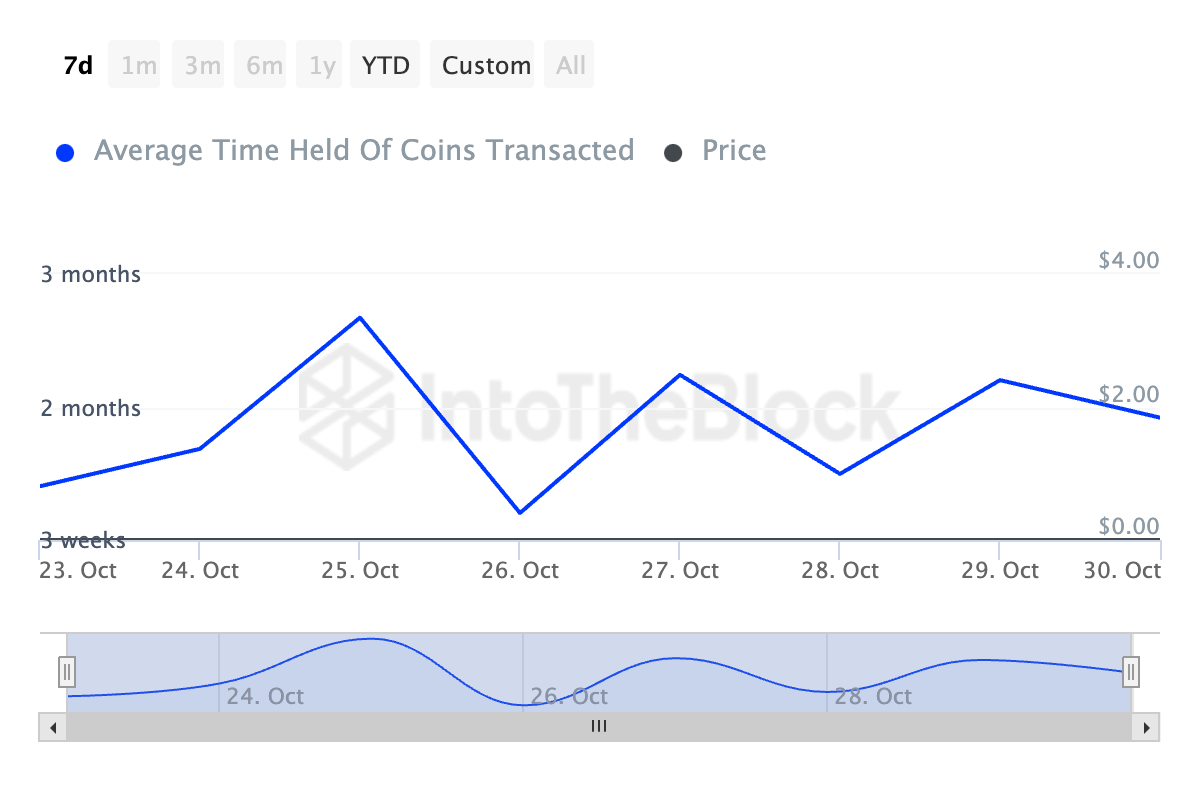 I tillegg har MOGs gjennomsnittlige holdetid økt i løpet av den siste uken, noe som har bidratt til den nylige prisøkningen. Ifølge data fra IntoTheBlock har myntens holdetid — som måler hvor lenge investorer holder mynter før de handler dem — økt med 20 % de siste syv dagene.