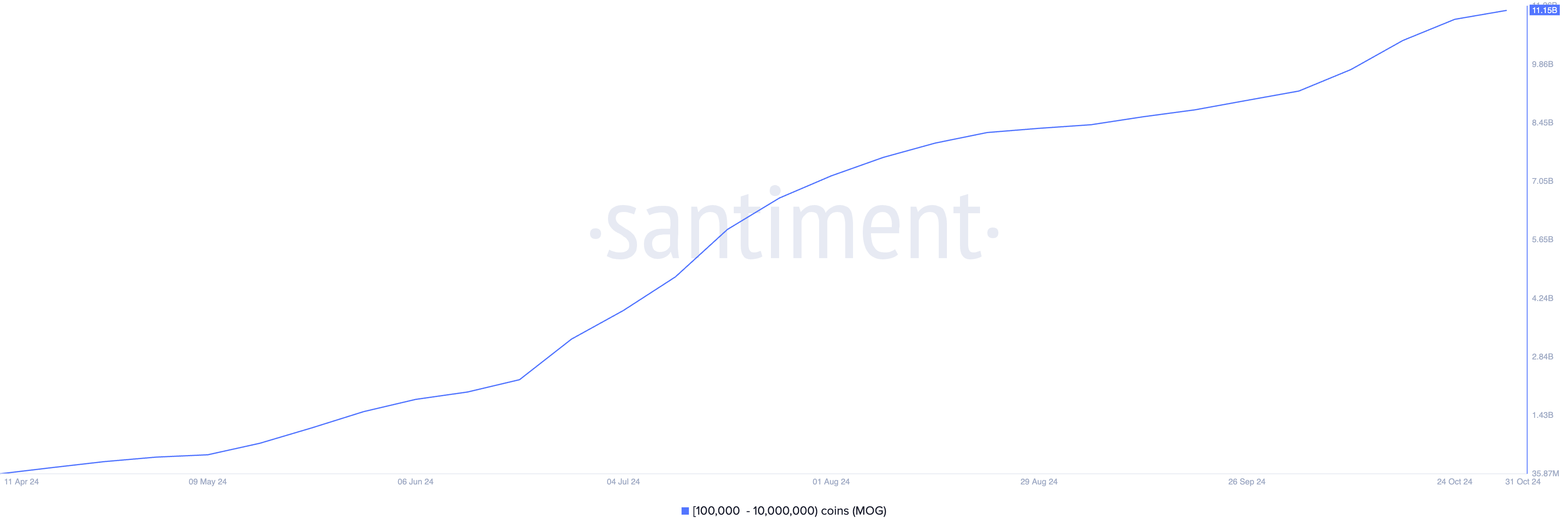MOG-hvaler som holder mellom 10 000 og 100 000 000 tokens har økt sine beholdninger den siste uken, og har lagt til imponerende 470 millioner MOG-tokens på bare syv dager. Denne gruppen eier nå kollektivt 11,15 milliarder MOG-tokens—det høyeste nivået siden tokenets lansering.