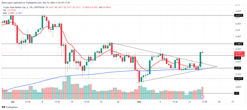 Den totale markedsverdien brøt ut av den symmetriske trekanten den har befunnet seg i den siste måneden på grunn av avtagende inflasjon. Dette brakte den totale verdien av alle kryptoaktiva til 2,32 billioner dollar, noe som tilførte nesten 140 milliarder dollar i løpet av en enkelt dag.