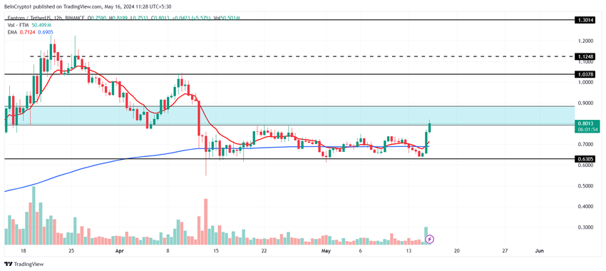 Blant alle de beste altcoinsene plasserte Fantoms prisstigning den øverst på listen over de beste eiendelene. Altcoin økte med mer enn 24% for å bryte $ 8-barrieren for øyeblikket. FTM har gått inn i motstandsboksen mellom $ 0.80 og $ 0.88.