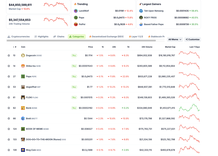 Ettersom Bitcoin treffer et to måneders lavpunkt på $ 57,500, forlater mange kryptoinvestorer strategisk flyktige meme-mynter. Den bredere markedsnedgangen har spesielt påvirket disse digitale eiendelene, kjent for sin spekulative natur, noe som har ført til betydelige nedsalg.